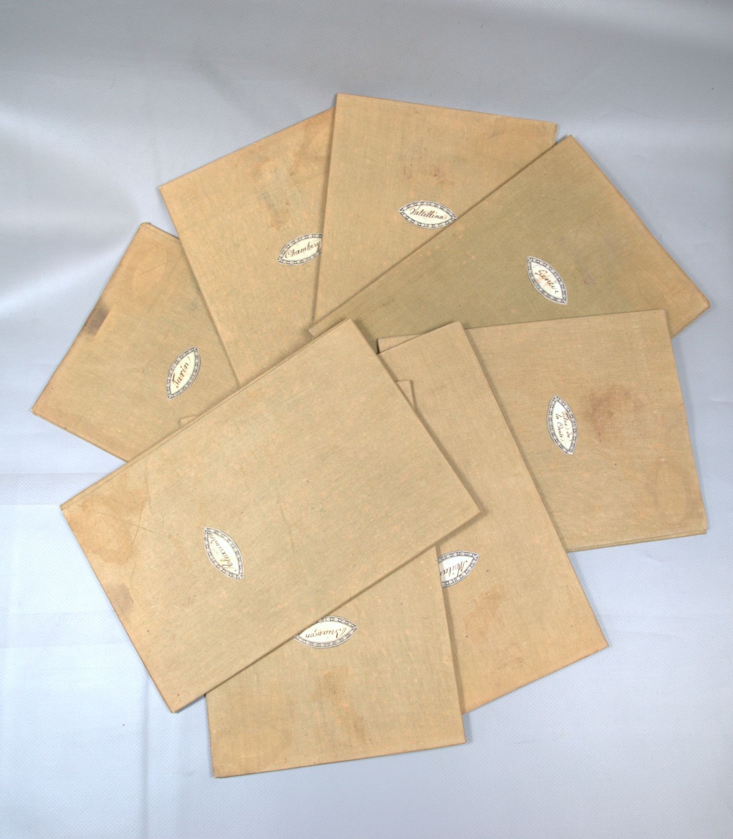Erste Ausgabe dieser bedeutenden und detailreichen Wandkarte. Mit Turin im Zentrum und in der Begrenzung Cannes-Genf-Brescia-Massa, die Ortsbezeichnung jeweils oberhalb der einzelnen Karten. – Alle Blatt stockfleckig, das Leinen etwas gebräunt und teils fleckig. Blatt IV mit hs. Markierungen in Buntstift, Blatt V ankoloriert.