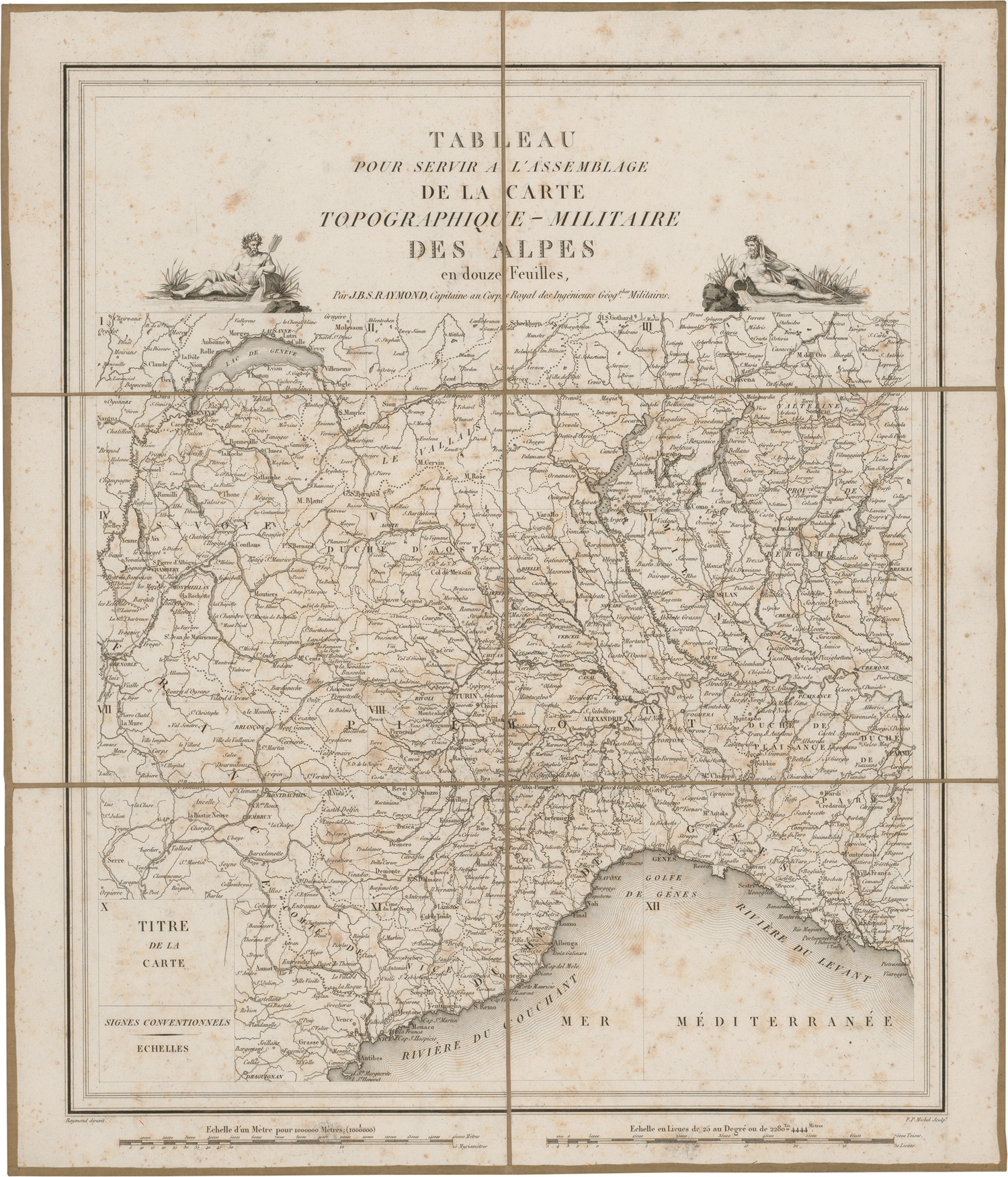 Italien. - Raymond, J. B. S. Carte topographique militaire des Alpes comprenant le Piémont, la Savoye, le Comté de Nice. (58,5:45 cm). 13 (1 teilkoloriert; 12 nummeriert) Kupferkarten in je 8 Segmente auf Leinen aufgezogen. Ca. 52 x 69 cm bzw. 52 x 44,5 cm. Pappschuber d. Z. Paris 1820.