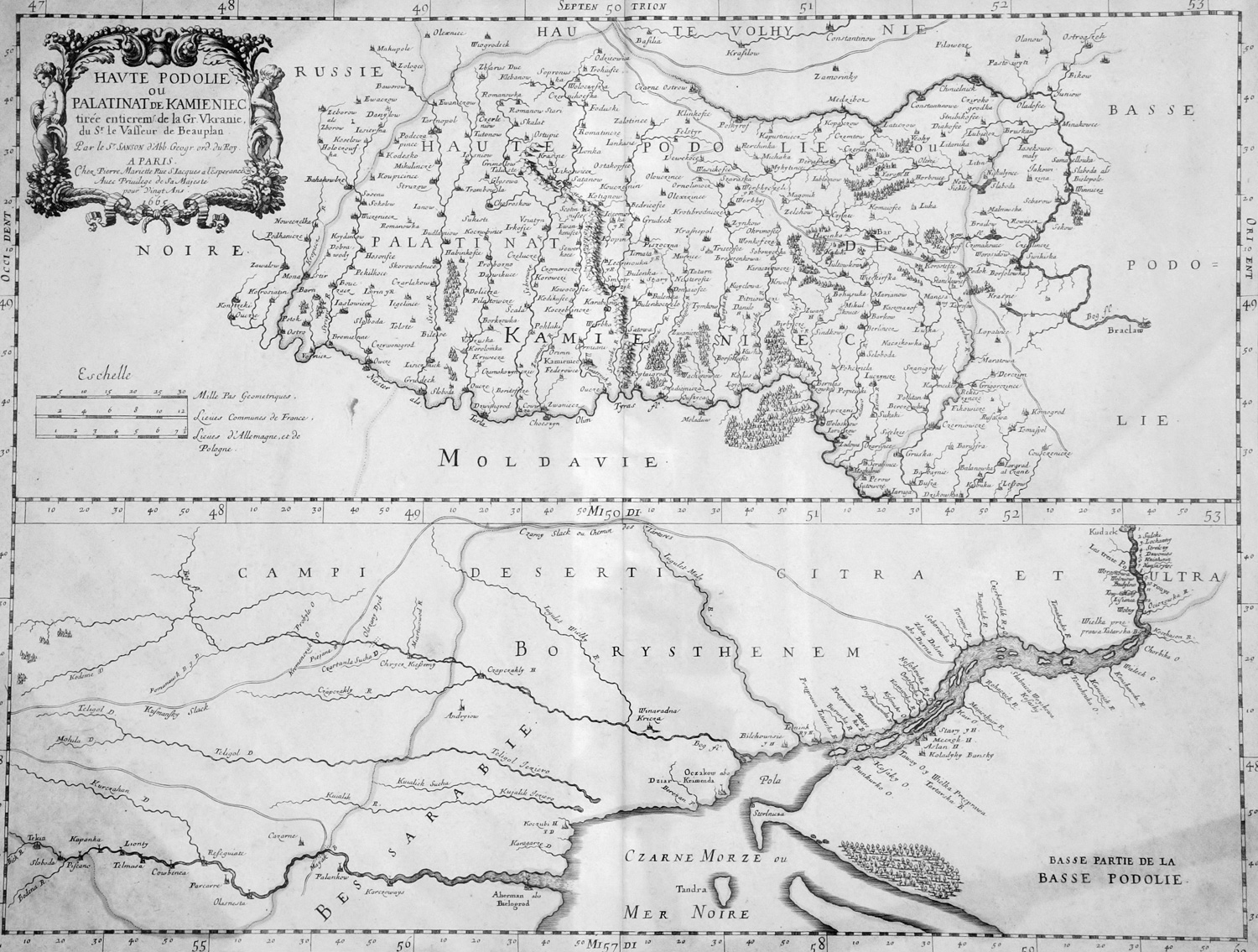 Sanson, Nicolas und Guillaume de l'Isle. Haute Podolie, ou palatinat de Kamieniec, tirée entièrement de la Gr. Ukraine du S.r le Vasseur de Beauplan. Grenzkolorierte Kupferstichkarte. 40,5 x 53 cm (Plattenrand). Unter Glas mit Passepartout mit goldgeprägter Holzprofilleiste. Paris 1665.