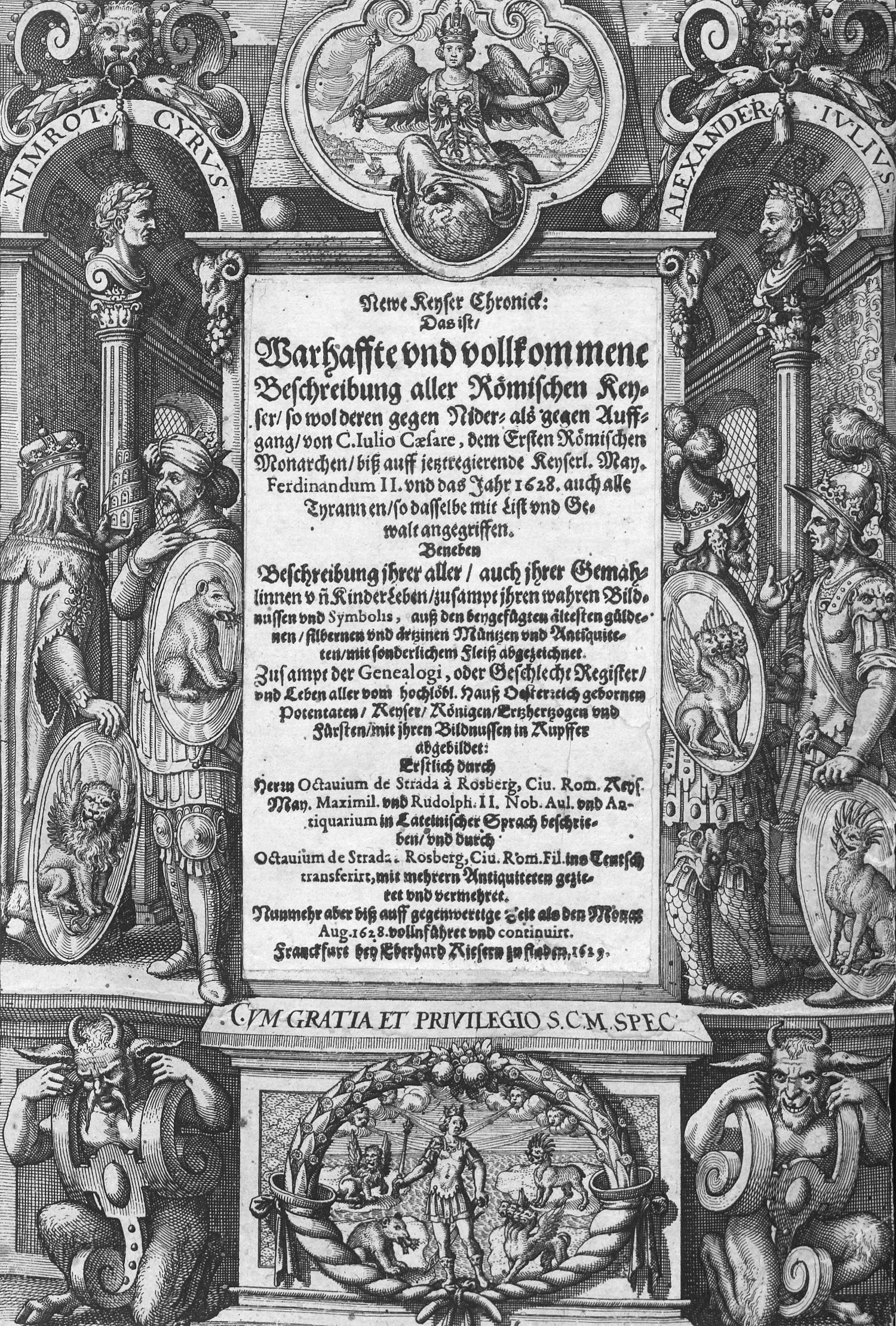 Strada à Rosenberg, Octavius de. Newe Keyser Chronick: Das ist, Wahrhaffte und vollkommene Beschreibung aller Römischen Keyser. Beneben Beschreibung ihrer aller, auch ihrer Gemahlinnen und Kinder Leben. Nunmehr aber biß auff gegenwertige Zeit also den Monat Aug. 1628 vollnführet und continuirt. 4 (statt 5) Bl. 596 S., 6 Bl. (l. w.). Mit szenischer gestochener Titelbordüre, Wappenkupfer und rund 570 Münzkupfern im Text. 29,5 x 19 cm. Pergament d. Z. (stärker fleckig und berieben, vorderes Gelenk geplatzt, mit hs. RTitel, Schließbänder teils lädiert). Frankfurt, Eberhard Kieser, 1629.