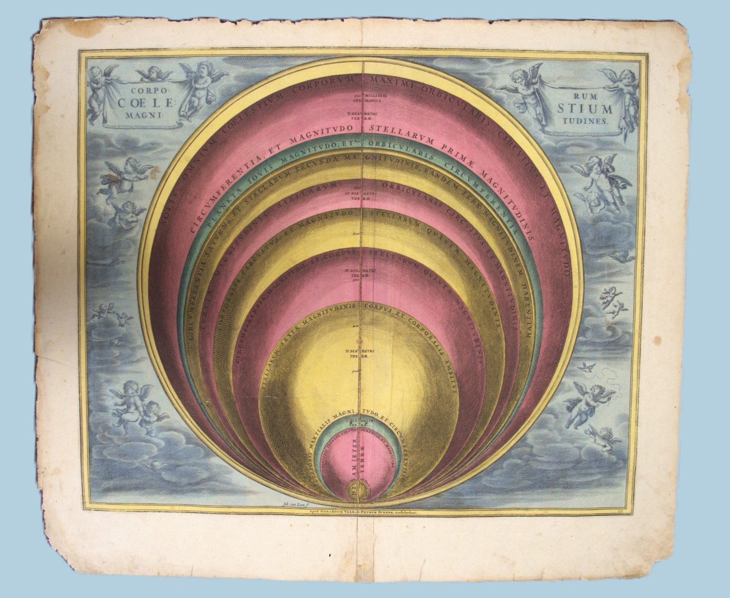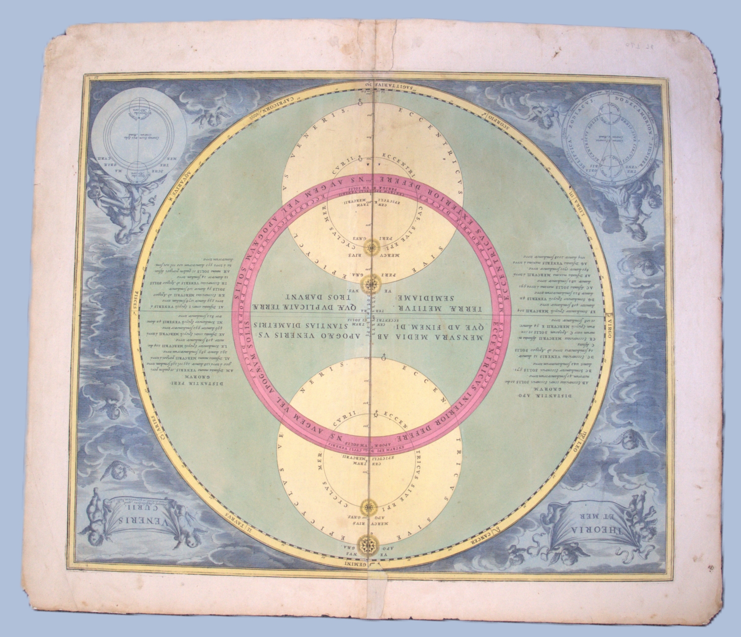 Aus dem Atlas Coelestis seu Harmonia Macrocosmica, dem ersten in den Niederlanden erschienenen Himmelsatlas. Andreas Cellarius (1596-1665) vereinte hierin die kosmologischen Systeme von Ptolemäus, Kopernikus und Tycho Brahe. – Starke Randschäden und -Läsuren, teils mit Einrissen und Wasserflecken. Die Darstellungen selbst überwiegend gut erhalten und im schönem, kräftigem Kolorit.