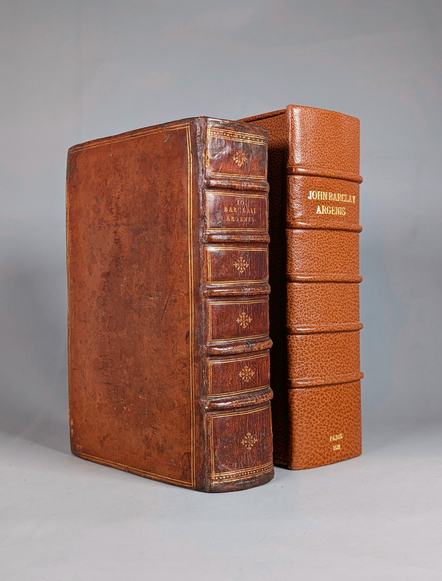 Barclay, John. Argenis. 8 Bl., 1208 S., 1 Bl. Mit Holzschnitt-Druckermarke auf dem Titel. 19 x 12,5 cm. Geglätteter französischer Kalbslederband d. Z. mit goldgeprägten Deckelfileten, ornamentaler RVergoldung und RTitel in gefütterter Lederkassette. Paris, Nicolas Buon, 1621.