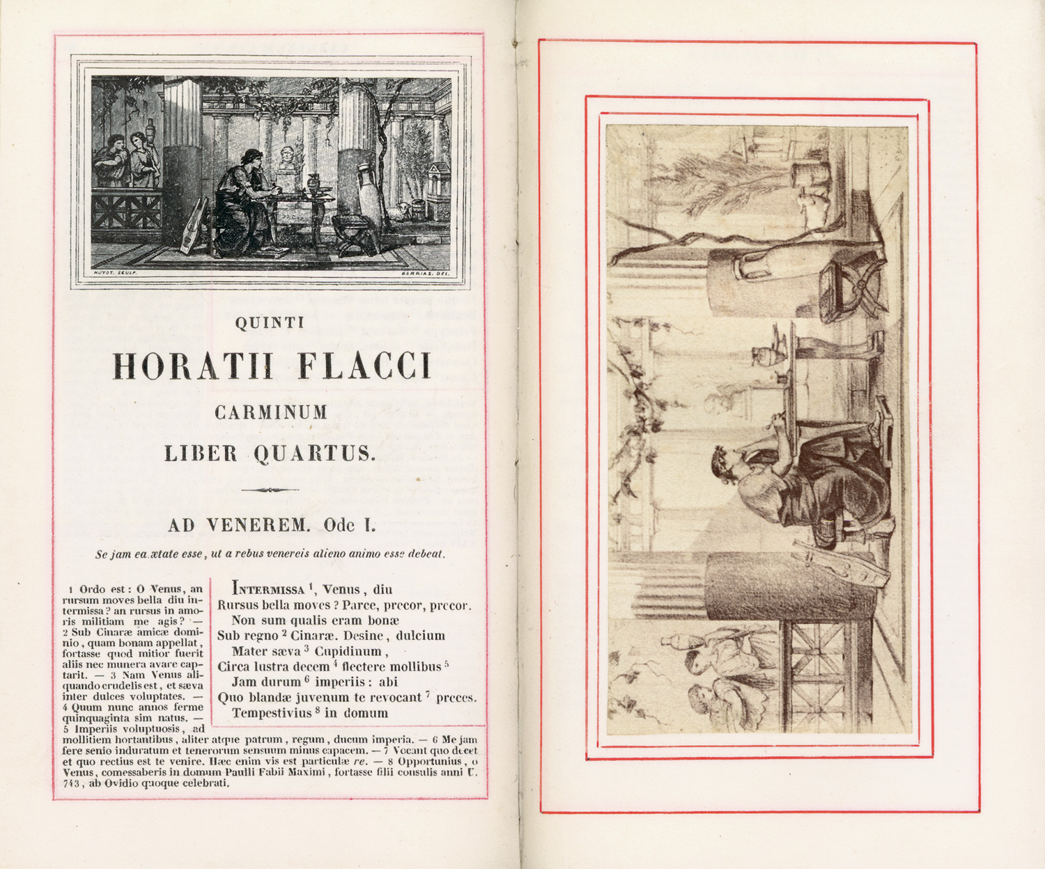 Engelmann-Preuss 284. Brunet III, 325. – Wohl unikales Exemplar auf Pergament mit den Seiteneinfassungen in Rotdruck, den zusätzlichen photographischen Ansichten (in der Normalausgage nicht enthalten) und den photographischen Vignetten (in der Normalausgabe sind diese als Holzstiche eingedruckt). Eines der frühesten Beispiele für die Verwendung von Photographien in der Buchillustration. "Charmante édition présentant un exellent texte, un commentaire latin rédigé avec autant de savoir que de goût par M. Dübner, une vie d'Horace en français par M. Noël des Vergers, une préface intéressante de M. Ambroise-Firmin Didot. Le volume est décoré d'un joli frontispice et de vignettes pour chaque livre, par M. Barrias, et des exemplaires ont de plus les plans de la villa d'Horace et des campagnes environnantes, dressés par M. Rosa, et en outre les vues de ses campagnes, dessinées sur les lieux par M. Benouville" (Brunet). Die Ansichten bzw. Pläne zeigen Lage und Umgebung von Horaz' ehemaligem Landhaus. "The editor of the Horace refers to photography as the 'marvel of our century' ... occassionally photographs of engravings were vitilized in books of poems as a vehicle to reproduce drawings or engravings: the 1855 Horace ... In both cases photographs replace engravings, assuming more of a functional than esthetic role" (The truth of lens, N. Y. Grolier Club, 1980 Nr. 179). – Aus der Bibliothek des Felix Durosier, mit dessen gestochenem Exlibris im Innendeckel. Minimale Gebrauchsspuren, teils leicht gewellt, insgesamt von sehr guter Erhaltung