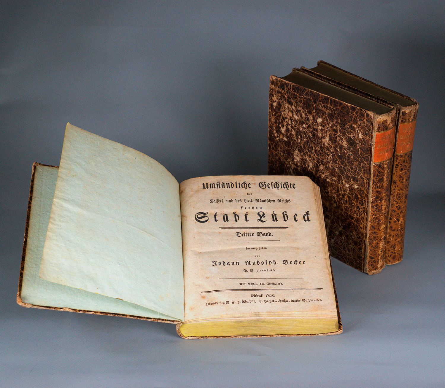 Becker, Johann Rudolph. Umständliche Geschichte der Kaiserl. und des Heil. Römischen Reichs freyen Stadt Lübeck. 3 Bände. 19,5 x 16 cm. Pappband d. Z. (berieben und bestoßen) mit goldgeprägtem RSchild. Lübeck, Georg Christian Green bzw. (Band III:) G. F. J. Römhild, 1782-1805.