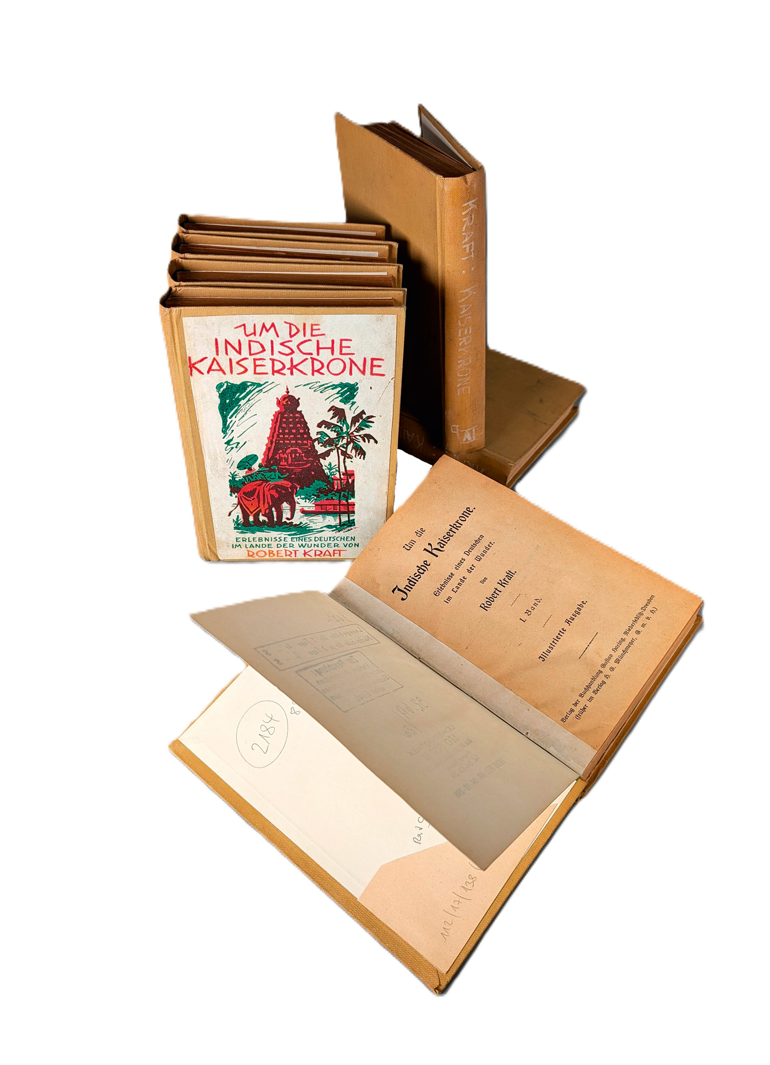 Kolportage. - Kraft, Robert. Um die Indische Kaiserkrone. Erlebnisse eines Deutschen im Lande der Wunder. Illustrierte Ausgabe. 4 Teile in 8 Bänden. 17 x 12 cm. Etwas spätere Leinenbände (etwas fleckig und berieben, mit hs. Bandzahl auf dem Rücken; 3 farbig illustrierte OUmschläge montiert). Dresden-Niedersedlitz, Gustav Haring, (1927).