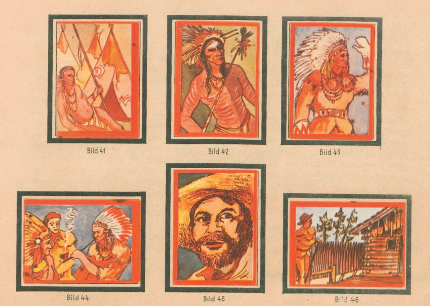 May, Karl. - Mit Karl May im Wilden Westen. Eine Erzählung. Seine Abenteuer und Erlebnisse in 120 Bildern. 17 Bl. Mit 120 montierten farbigen Sammelbildchen (komplett). 22 x 24,5 cm. Farbig illustrierte OBroschur (etwas fleckig und berieben, kleinere Randknicke). Bremen, C. E. Schünemann, (1942).