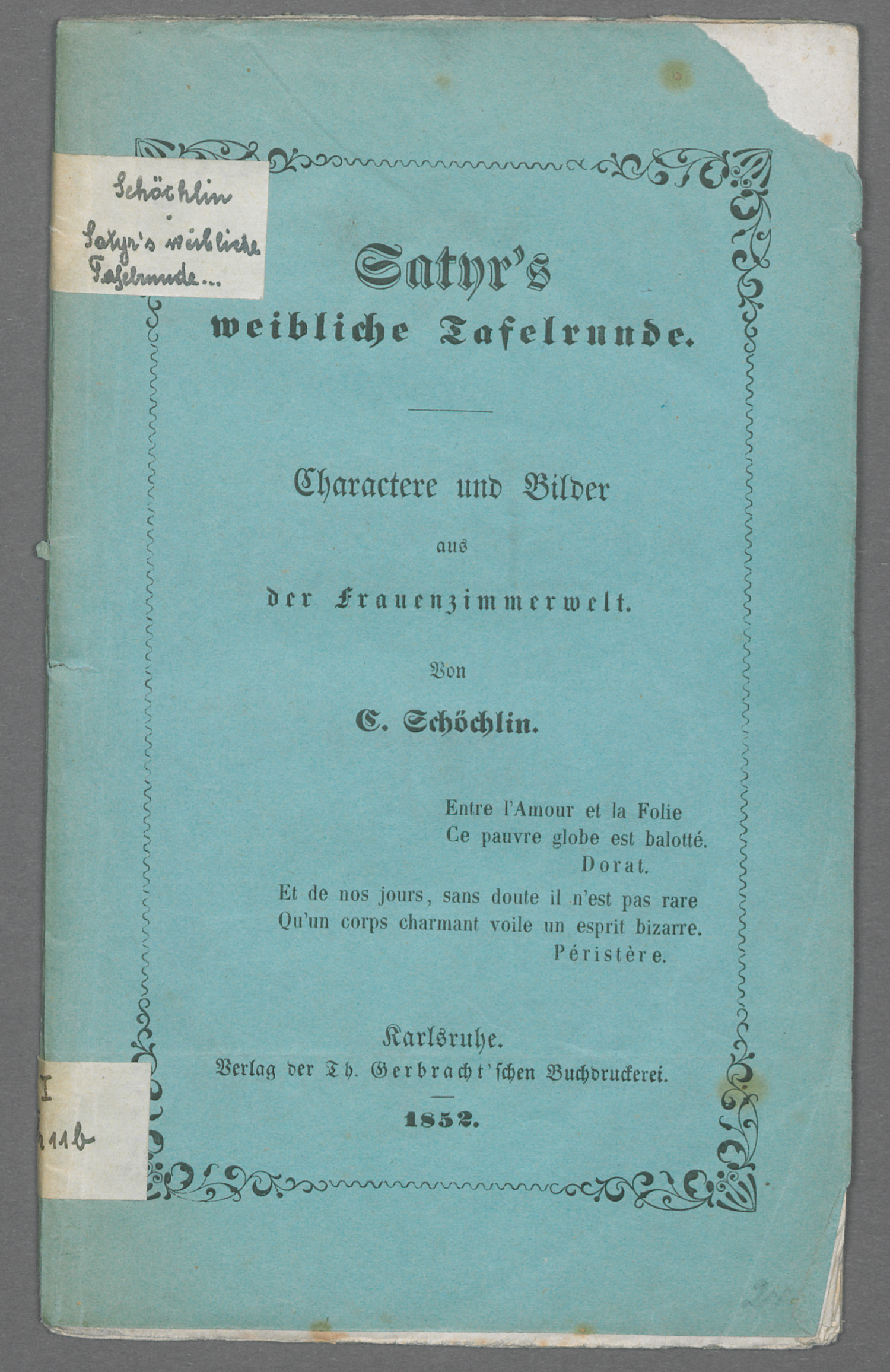 Schöchlin, Karl. Satyr's weibliche Tafelrunde. Charaktere und Bilder aus der Frauenzimmerwelt. 70 S., 1 Bl. (Errata). 18 x 11 cm. OBroschur (leichte Knickspuren, vordere rechte Ecke defekt, mit hs. RSchild). Karlsuhe, Th. Gerbracht, 1852.