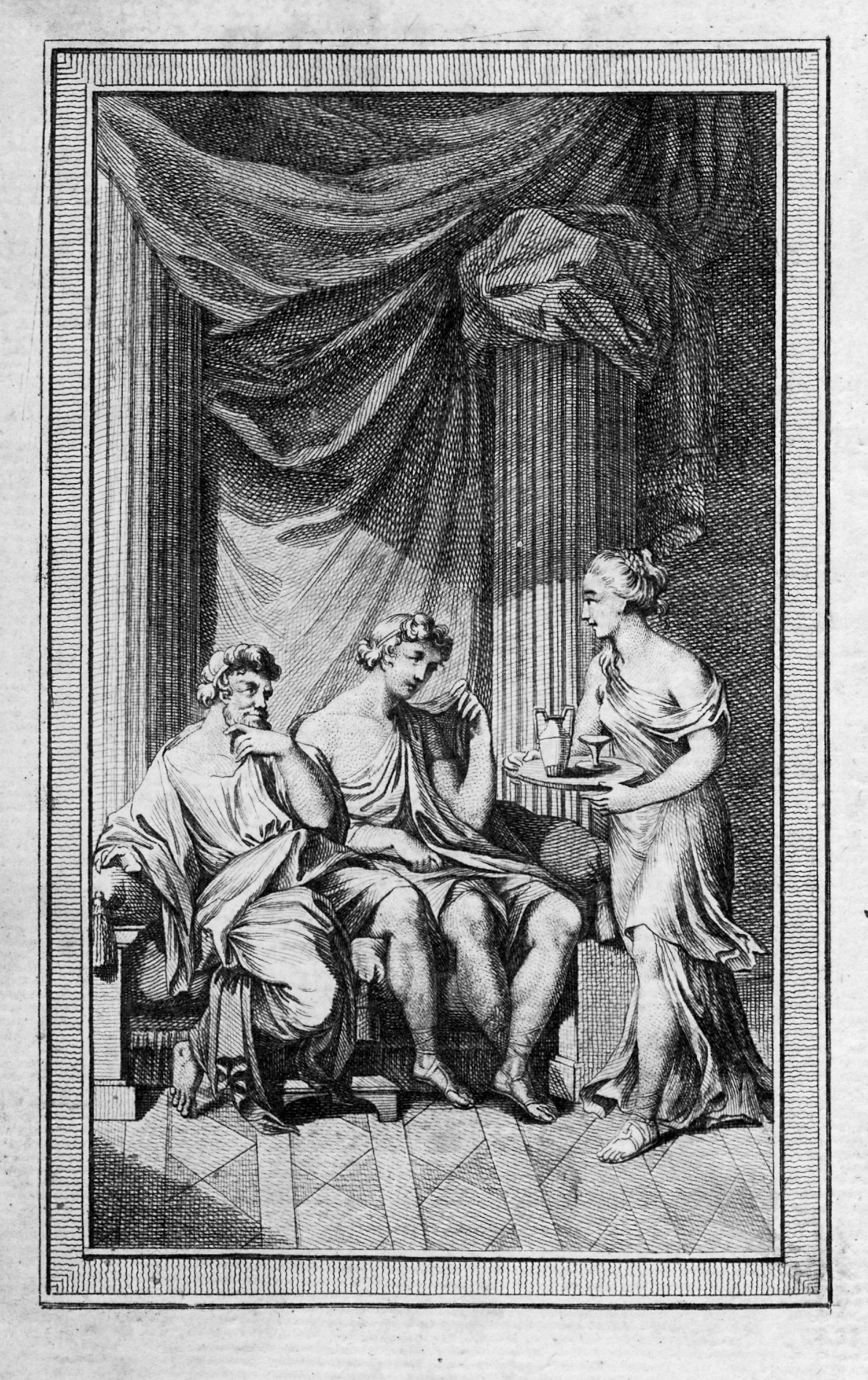 (Wieland, Christoph Martin). Agathon. 4 Bände. Mit 4 gestochenen Frontispices und 4 gestochenen TVignetten. 15,5 x 9 cm. Halbleder d. Z. (Deckel fachmännisch restauriert, Ecken leicht bestoßen) mit floraler RVergoldung und 2 goldgeprägten farbigen RSchildern. Leipzig, Weidmanns Erben und Reich, 1773.