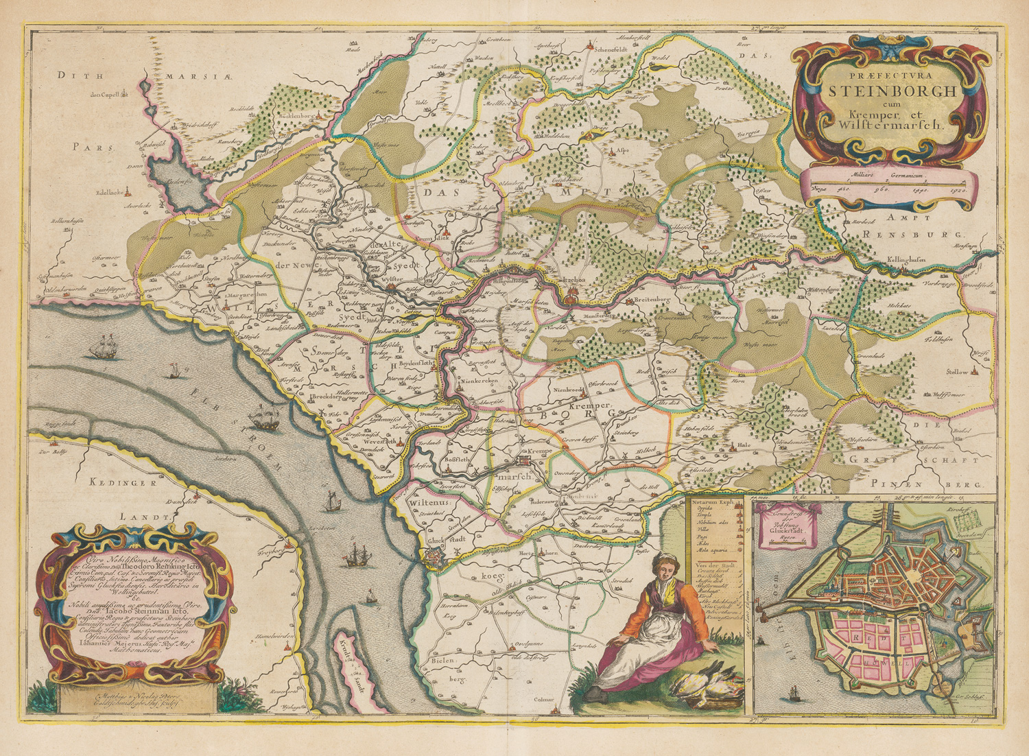 Dekorative Karte der Präfektur Steinburg mit Kremper- und Wilstermarsch, entworfen von Johannes Mejer (1606-1674) und gestochen von den Brüdern Matthias und Nicolaus Petersen. Die Darstellung zeigt das Gebiet zwischen Wedel im Norden und Bielenberg im Süden und ist reich ausgestattet mit Titel- und Dedikationskartuschen, Figuren, Meilenzeiger sowie einer Insetkarte mit Grundriss und Ansicht der Festung Glückstadt. Die Karte erschien bei Joan Blaeu als Teil des "Atlas Major". – Papierbedingt nur leicht gebräunt. Gut erhalten, nicht ausgerahmt. Versand erfolgt ohne Rahmen.