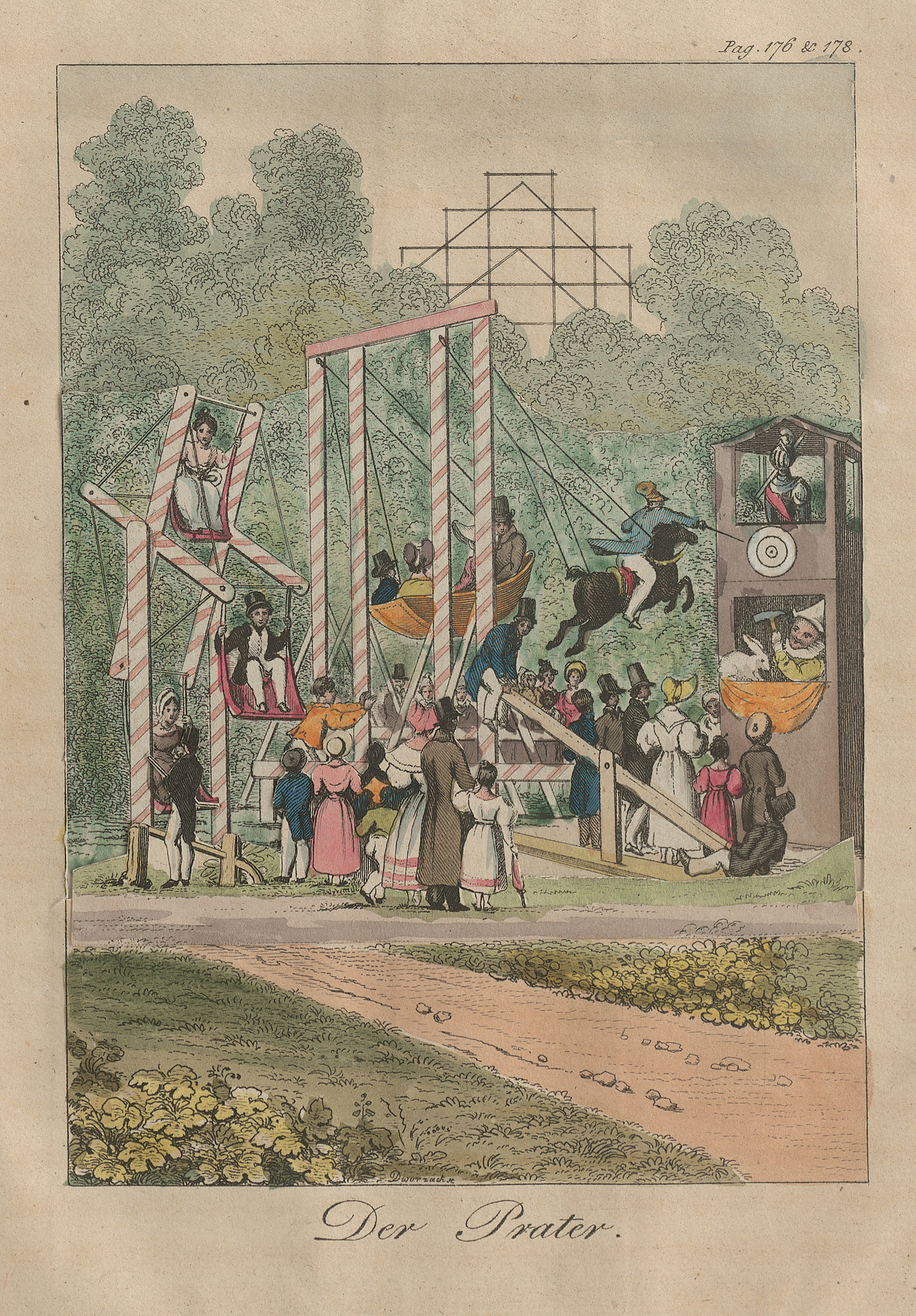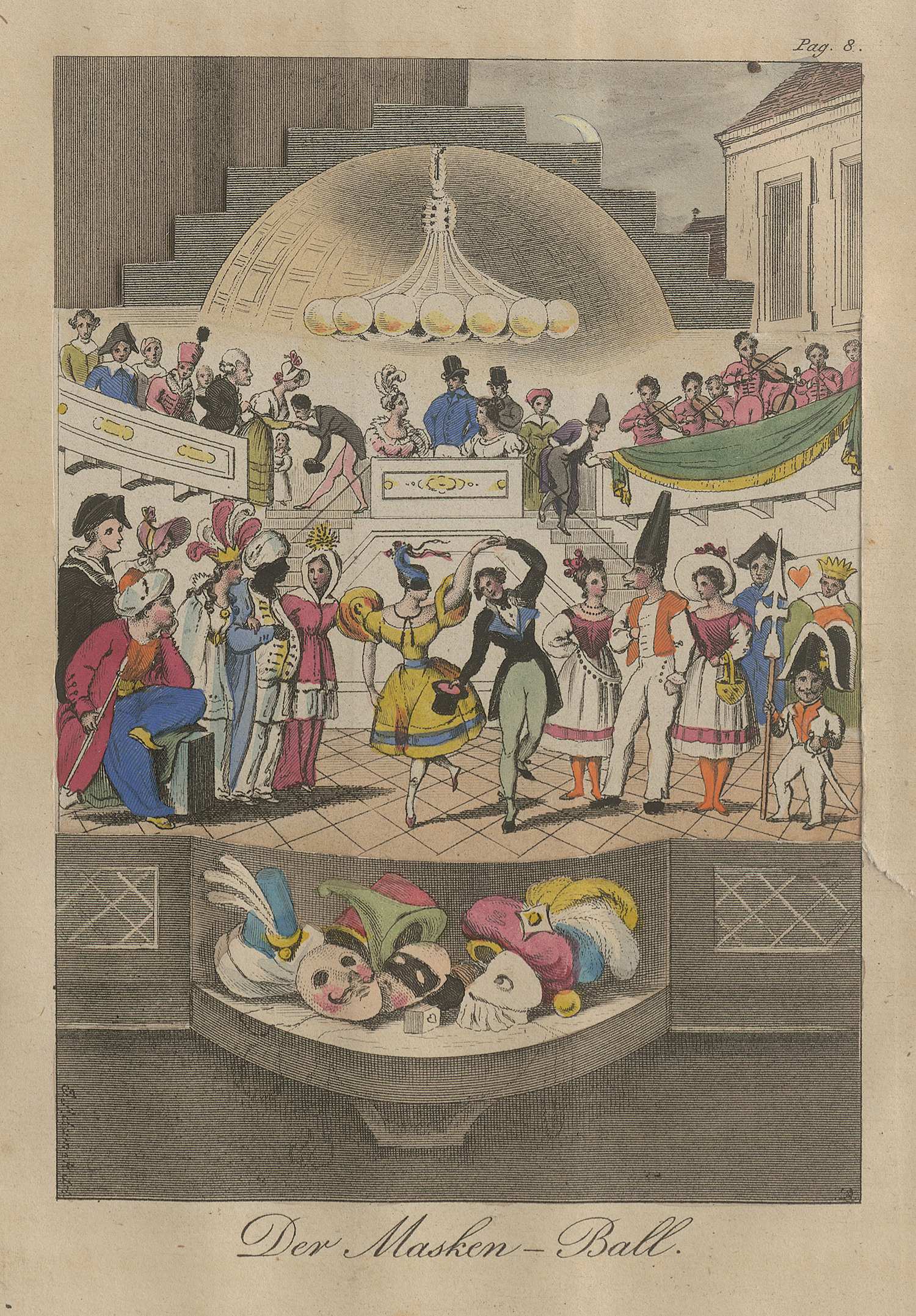 Seebaß II, 344. - Rümann 76. - Pressler S. 117. - Goedecke VI, 584, 81. – Frühe und seltene Folge beweglicher Hebelzug-Billets. Vorliegend ausschließlich die Serie der kolorierten Kupferstiche ohne den Begleittext und Einband. Die schön kolorierten und sorgfältig ausgeführten Tafeln sind funktionsfähig und zeigen lebhafte Genreszenen: Gesellschaftstänze, Kapellen, einen Jahrmarkt sowie städtische und ländliche Vergnügungen. Die sechs unten betitelten Tafeln zeigen: "Der Masken-Ball, Die Rückkehr des Bruders, Nachkirchweihe, Die Jagd, Der Prater, Musik und Tanz." Beim Betätigen des Hebelmechanismus treten sukzessive Figurenstaffeln hervor, wodurch die Darstellungen ihre Lebendigkeit erhalten. – Die Ziehstreifen fachmännisch modern restauriert und intakt; im oberen rechten Rand jeweils mit Nummerierung. Hübsch und frisch koloriert. Das Blatt Der Masken-Ball mit kleinem Randeinriss im Bereich des Mechanismus. Selten.
