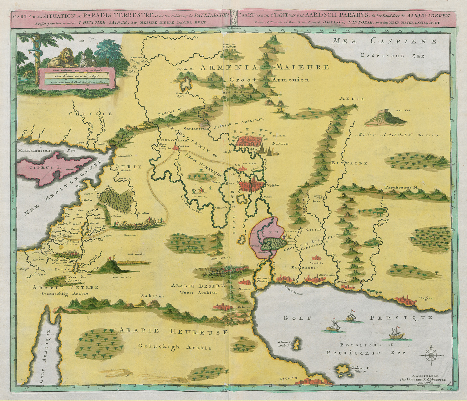 Huet, Pierre Daniel. Carte de la situation du paradis terrestre. Flächenkolorierte Kupferkarte. 53 x 61 cm. Amsterdam, Covens & Mortier, 1691.