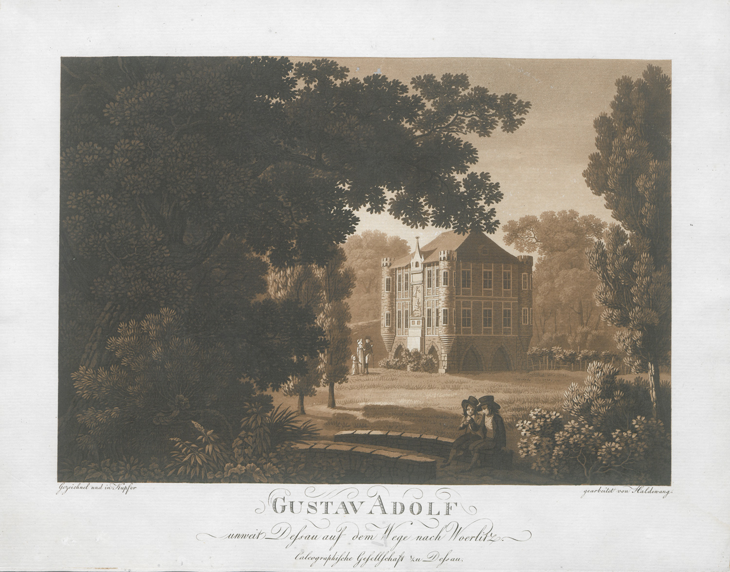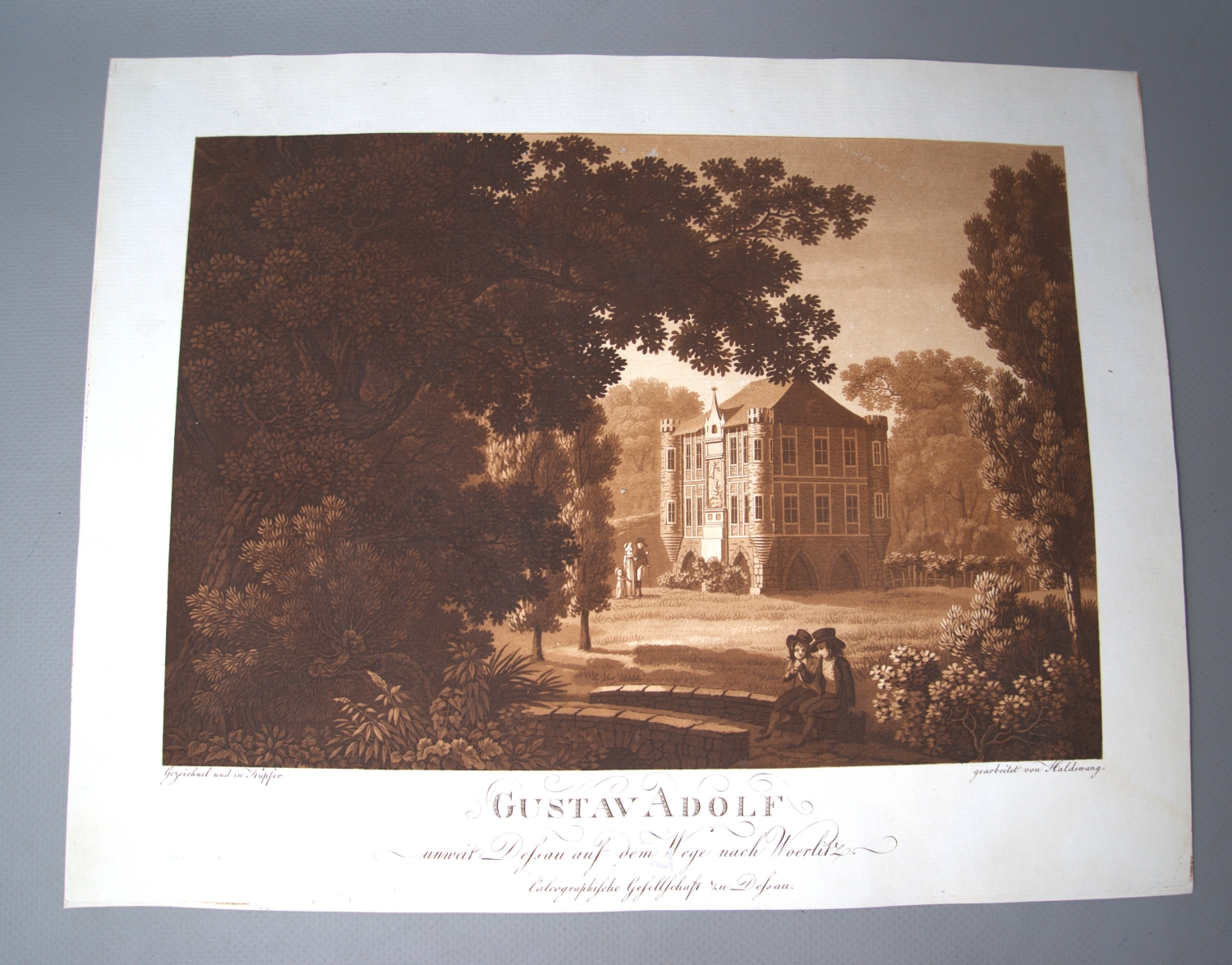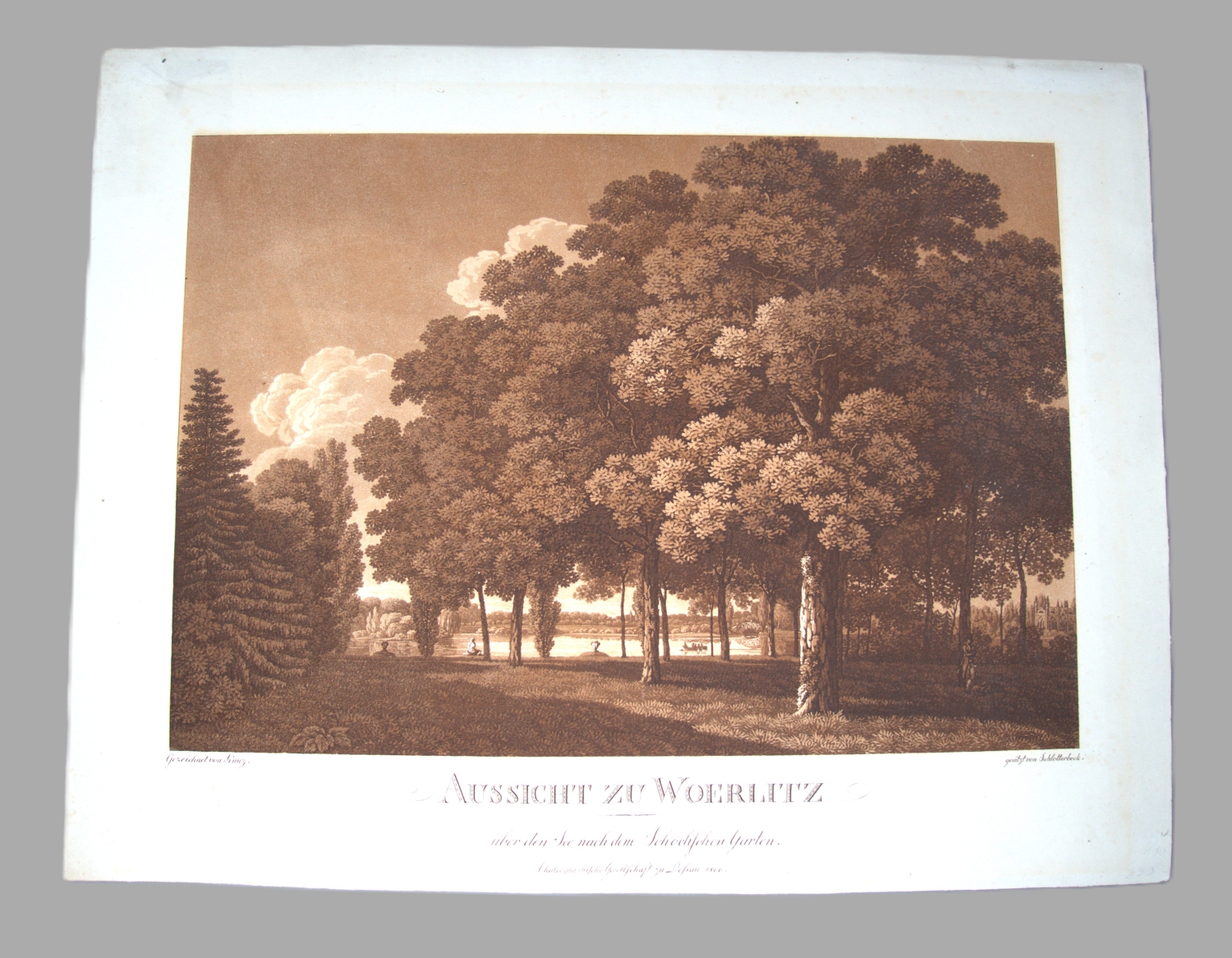 Wörlitz. Gustav Adolf unweit Dessau auf dem Wege nach Woerlitz [und:] Aussicht zu Woerlitz über den see nach dem Schochschen Garten. Radierung in Sepia von Haldewang und Schlotterbeck. 26 x 33 cm (Plattenrand). Dessau, Calcographische Gesellschaft, 1800.