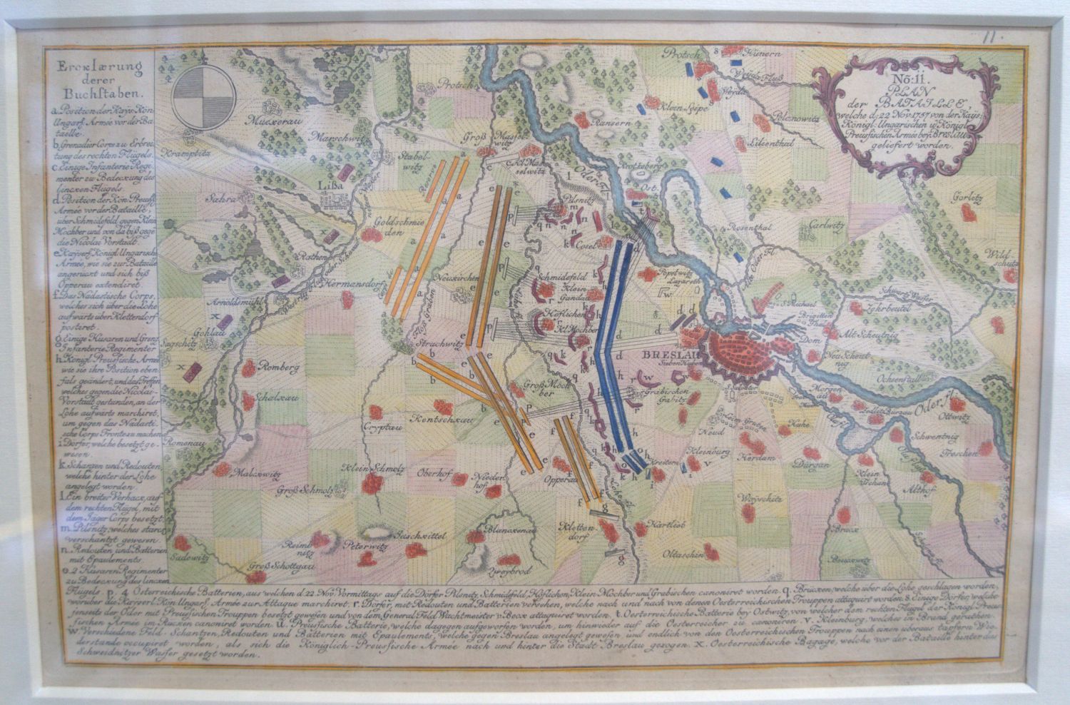 Vorhanden sind: I. Hartmann Schedel. Presslau. Kolorierter Holzschnitt aus der verkleinerten "Weltchronik". Augsburg 1500. - II. Matthäus Merian. Abris der Landscafft Schlesien samt der Angrentzeten Königreich und Ländern. Kupferkarte. Frankfurt 1646. - III. Derselbe. Wratislauia. Breßlaw. Kupferkarte. 1650. - IV. Plan der Bataille, 22. Nov. 1757 . bey Breslau. Kolorierter Kupferstich. Um 1760. - V. Martin Engelbrecht. Prospect der Kirch und Closters zu S. Dorothea auf der Schweidnitzischen gasse der P. P. Minoriten. Teils kolorierter Kupferstich von M. Steidlin nach F. B. Werner. Augsburg, M. Engelbrecht, um 1740. - VI. Derselbe. Prospect der Herr Praelatur von S. Vincentz Stifft und desselben Forhotels. Kupferstich von M. Steidlin nach F. B. Werner. Augsburg, M. Engelbrecht, um 1740. - VII. Derselbe. Prospect deß Gymnasü Mariae Magdalenae mit ümligender gegend. Kupferstich von M. Steidlin nach F. B. Werner. Augsburg, M. Engelbrecht, um 1740. - VIII. Das Fürstenthum Bresslau zum Bresslauischen Ober Amt gehörig. Grenzkolorierter Kupferkarte mit 3 Insetkarten. Berlin, Schleuen, um 1774. - IX. Vue de l'eglise de St. Marie Madelaine à Breslau. Guckkastenblatt. Kolorierter Kupferstich. Augsburg ca. 1760. - X. Franz J. J. von Reilly. Des Herzogthums Schlesien Fürstenthümer Sagan und Glogau oder die zur glogauischen Kammer gehörigen Kreise Glogau, Freystadt, Guhrau, Sprottau, Grünberg, Schwibusin, u. Sagan mit der freyen Standesherschaft Beuthen-Carolath. Nro. 106". Grenz- und flächenkolorierte Kupferstichkarte von Franz J. J. von Reilly. Wien, Reilly, 1791. – Teils papierbedingt gebräunt, mit Falzen und kleineren bis größeren Gebrauchsspuren. Nicht ausgerahmt, Versand nur ohne Rahmen.