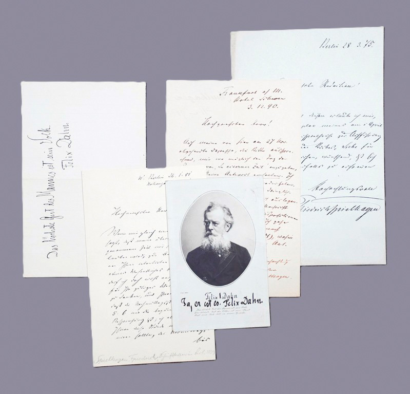 "Ja, er ist es. Felix Dahn". Erfüllung eines Autogramm-Wunsches für eine Verehrerin in Purkersdorf bei Wien. Unter dem Foto (Orig.-Abzug) befinden sich, sehr klein gedruckt, 3 Sentenzen des Autors: "Das höchste Gut des Mannes ist sein Volk. Das höchste Gut des Volkes ist sein Staat. Und seine Seele lebt in seiner Sprache." - Leichte Knick- und andere Gebrauchsspuren. - Beiliegend ein eigh. Albumblatt mit dem fast immer verwendeten Spruch Dahns: "Das höchste Gut des Mannes ist sein Volk. Felix Dahn". - Der von der Literaturgeschichte meist unterschätzte Verfasser von "Ein Kampf um Rom" starb nicht in Wroclaw, wie es bei Wikipedia heißt, sondern in Breslau. Von den zahllosen Werken des unglaublich fleißigen Gelehrten gehören seine rund 3000 Seiten umfassenden Memoiren zu den lesenswertesten. - 3 weitere Beilagen: Friedrich Spielhagen, Schriftsteller, erfolgreicher Romancier, Publizist und Literaturtheoretiker (1829-1911). 3 eigh. Briefe m. U. "Friedrich Spielhagen". Zus. 31/2 S. Gr. 8vo. Berlin und Frankfurt a. M. 1875-1890. - An verschiedene Adressaten, über die Aufführung von zwei seiner Stücke sowie ein Treffen wegen eines literarischen Projekts.