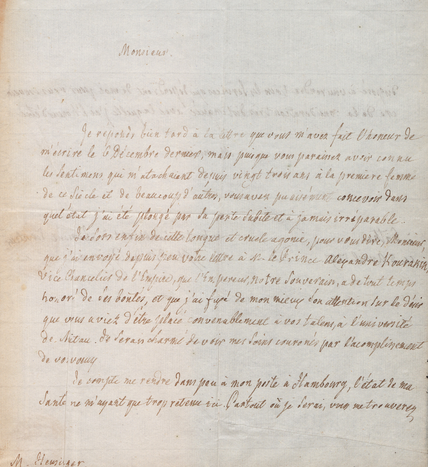 An den Pädagogen und Philosophen Johann Heinrich Gottlieb Heusinger (1766-1837), der die Verspätung von Grimms Antwort verzeihen möge, denn er kenne Grimm ja bereits seit 23 Jahren. Er habe Heusingers Brief an Alexander Kourakin, Vizekanzler des Russischen Reiches, geschickt; der Brief enthielt den Wunsch Heusingers, eine Professur an der Universität Mitau zu erhalten. Er, Grimm, werde sich bald wieder an seinen Posten in Hamburg begeben. - Heusinger veröffentlichte in diesem Jahr ein zweibändiges "Handbuch der Ästhetik", das in Gotha erschien. - Grimm wurde vor allem berühmt als Herausgeber der