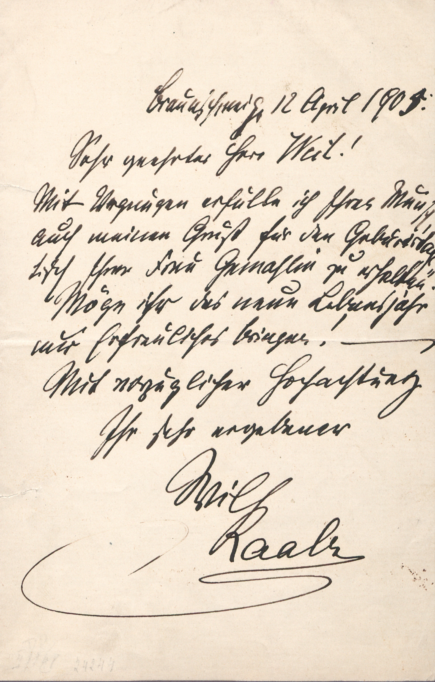 Raabe, Wilhelm, der bedeutende Erzähler des Realismus (1831-1910). Eigh. Brief m. U. " Wilh Raabe". 1 S. Doppelblatt. 8vo. Braunschweig 12.IV.1905.