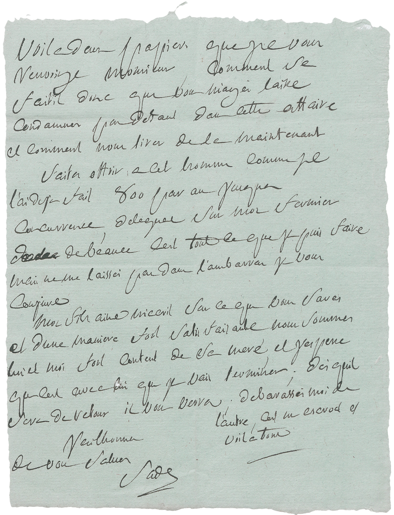 Sade, Donatien Alphonse Marquis de, Namensgeber des "Sadismus", franz. Schriftsteller und Philosoph, berüchtigt für seine gewaltpornographischen Romane und persönlichen Verhaltungsweisen, verbrachte große Teile seines Lebens in Gefängnissen und Irrenanstalten (1740-1814). Eigh. Brief m. U. "Sade". 1 S. auf bläulichem Papier. 4to. O. O. (wohl vor 1800).