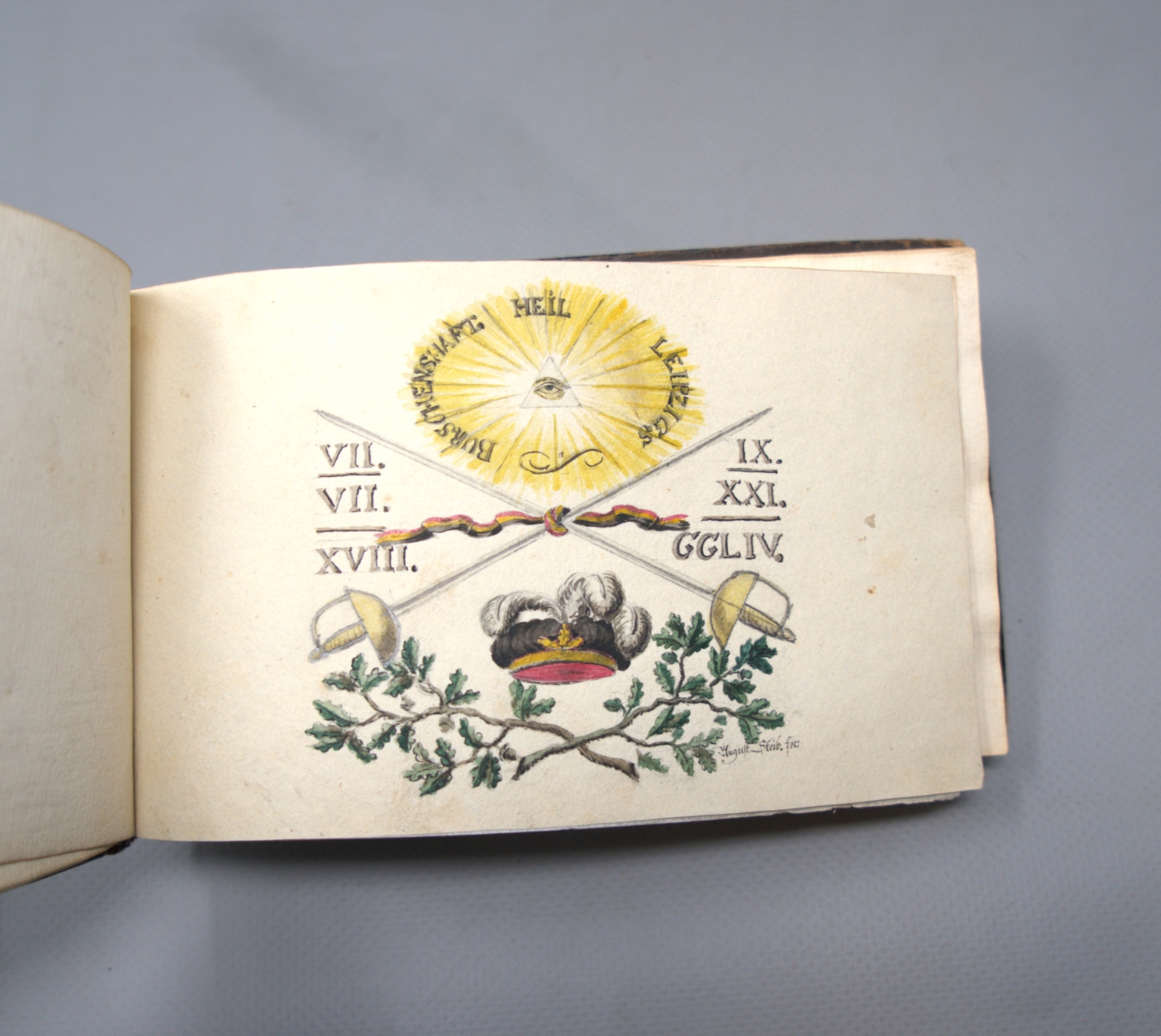 Reizvoll illustriertes Stammbuch, das zwar nur drei (politisch bewegte) Jahre umfasst, den Inhaber jedoch auf einige Reisen begleitet. Die Beiträge stammen von Eltern, Geschwistern und anderen Verwandten vornehmlich in Berlin, ab 1812 aber bereits Magdeburg, wo der Vater und Freunde wohnen, dann Strehlen, Leipzig (?), Hamburg und 1814 nur noch Neuwied. Die hübschen Illustrationen zeigen ein Bauernhaus, idyllische Schäfer-Szenen, Tempel und Denkmäler der Freundschaft, Blumengebinde sowie 1 Blatt mit farbigen Symbolen einer Leipziger Burschenschaft. - Dabei: Stammbuch der Ida Hiege aus Stendal. 34 Bl., davon 17 S. beschrieben oder illustriert. Mit 4 kolorierten Kupfertafeln und 1 mit Goldschrift bedruckten Titelblatt. Quer-8vo. Ziegelroter Halblederband d. Z. mit goldgeprägten Bordüren und Vignetten auf beiden Deckeln sowie Rückenvergoldung und Aufdruck "Denkmal der Freundschaft". Goldschnitt. 1837-1842. - Die Eintragungen von Verwandten und Freundinnen. Nur der früheste Beitrag in Stendal, die weiteren in Potsdam und Angermünde. Die reizvollen kolorierten Kupfer zeigen Liebes- und Harmonie-Szenen, sind nummeriert und scheinen aus der Berliner Werkstatt von C. Schauer zu stammen.
