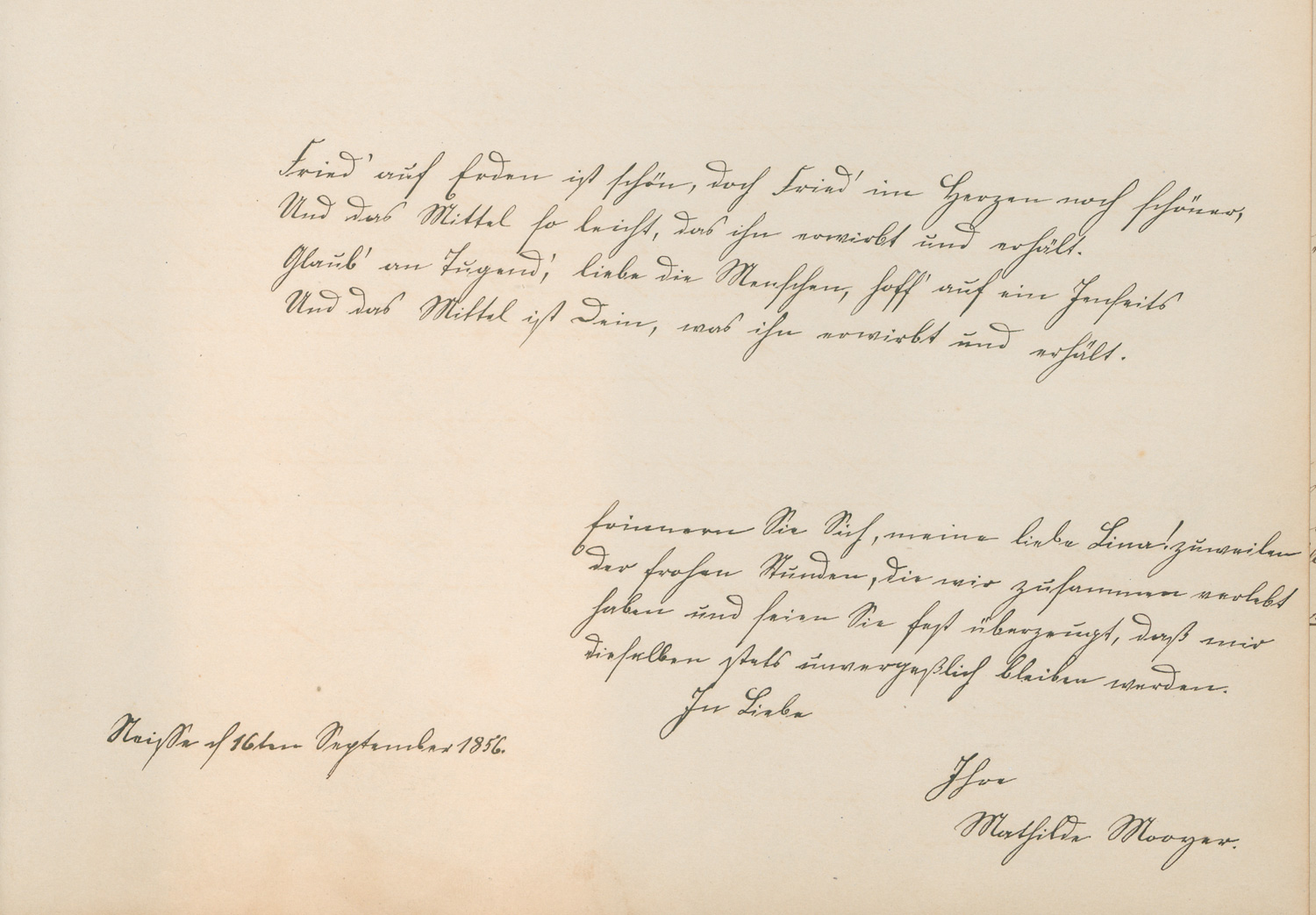 Umfangreiche Gedicht- und Prosa-Zitate, eingetragen von Freundinnen in Sorau und Neisse. Im März 1854 in Sorau beginnend, stammen die Beiträge großenteils von jungen Mädchen aus Adelsfamilien. Am 22. März, "Sorau 14 Tage vor Deiner Confirmation", trägt sich als ihr "Seelensorger" der "Archidiaconus" M. Kirchner ein. Als erste hatte sich Cäcilie v. Schlicht im Album verewigt; es folgen Clementine v. Goldammer, Clothilde v. Schwarzkoppen, Agathe v. Bredow, Thekla Deutsch, geb. v. Horn, Elise, Ida und Eveline v. Gallwitz, Carola, Marie, Jenny und Auguste v. Sobbe, Wilhelmine v. Prondzynska, Toni und Minna v. Triebenfeld, Elisabeth v. Diezelski, Emma v. Kriegstein, Lina v. Schickfuß, Anna v. Besserer. 3 Eintragungen stammen nicht aus Sorau oder Neisse: 1855 Onkel und Tante v. Goldbeck in Hamm sowie 1858 Louise v. Borcke in Berlin. Ferner ein Anzahl bürgerlicher Familien. Zitiert werden längere Passagen aus Werken von Jean Paul, Matthisson, Uhland, Leopold Schefer, Lenau, Geibel, Heine, Victor Hugo und anderen. - Beiliegend handschriftliche Notizen eines Johannes Meyer in Berlin zur Provenienz des Albums, das angeblich einst auch eine Eintragung des Dichters Joseph von Eichendorff enthielt, wozu Meyer notiert: "habe ich für 7,50 Mk West verkauft." - Eichendorff starb 1857 in Neisse.