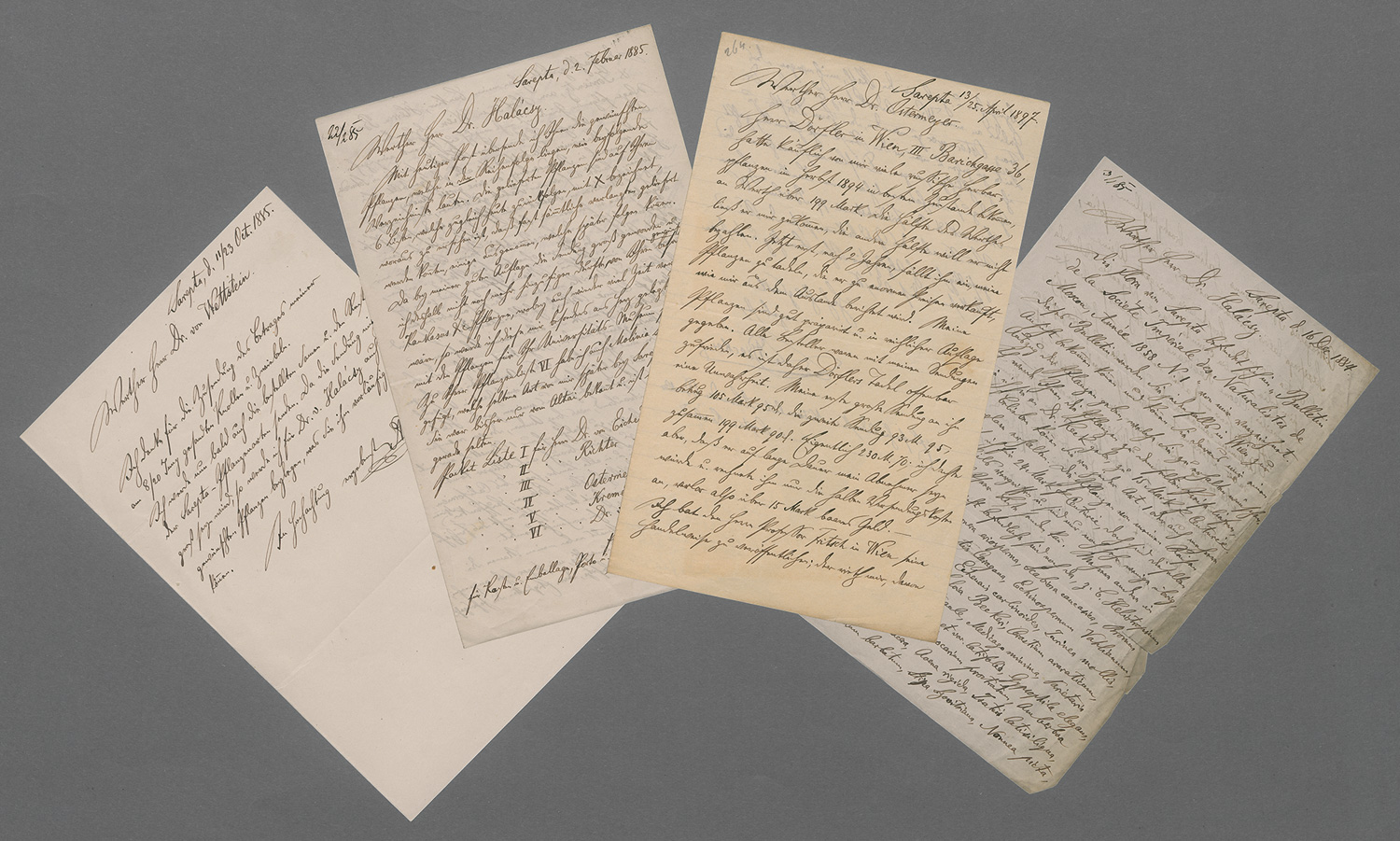 An verschiedene Fachkollegen, darunter die österreichischen Botaniker Richard Wettstein (1863-1931) und Eugen von Halácsy (1842-1913). Fachkorrespondenz über botanische Präparate, Pflanzensendungen und Artenbestimmungen, Preisverhandlungen sowie den Austausch wissenschaftlicher Materialien. Mit Mitteilungen "von der Flora der Sarepta", Danksagungen für Ertragsauszahlungen und Hinweisen auf den Verkauf und Weiterverkauf seiner Pflanzenpräparate und weiteres mehr. – Ein Brief von 1884 papierbedingt etwas stärker gebräunt und mit Faltspur am Rand.