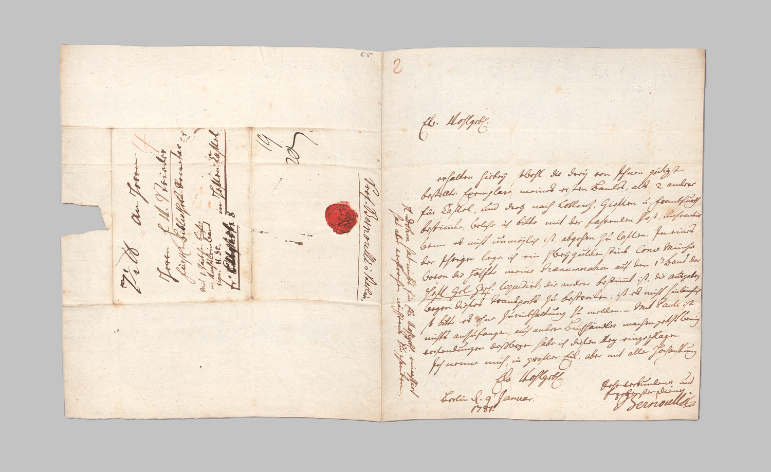 Bernoulli, Johann III., aus der Schweiz stammender Mathematiker und Kgl. preußischer Astronom, Leiter der Berliner Sternwarte, Mitglied der Berliner Akademie, Ehrenmitglied der russischen Akademie der Wissenschaften in St. Petersburg, besuchte Kant in Königsberg, wurde in Köpenick beerdigt (1744-1807). Eigh. Brief m. U. "Bernoulli". In deutscher Sprache. 1 S. Doppelblatt mit Adresse und Lacksiegel. 4to. Berlin 9.I.1781.