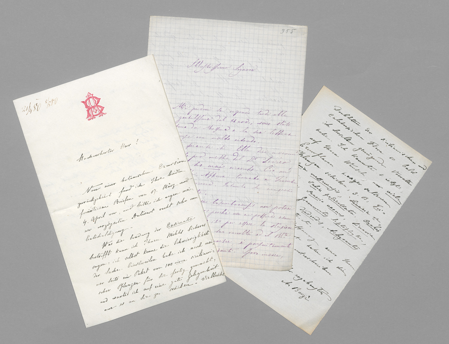 An Eugen von Halácsy (1842-1913), Wiener Botaniker und Arzt ungarischer Herkunft. Vorwiegend fachliche Korrespondenz über den Austausch botanischer Präparate, insbesondere sizilianischer Pflanzen. Borzì entschuldigt sich in einem Schreiben für seine unzulängliche deutsche Sprache und berichtet von seinen durch ungünstige Witterung erschwerten Sammelarbeiten in Messina. In den weiteren Briefen erörtert er den Versand eines Pflanzenpakets über Triest, verweist auf logistische Schwierigkeiten und erwähnt die Vorbereitung von rund hundert sizilianischen Exemplaren, darunter mehrere seltene Arten ("Linaria triphylla, Linaria reflexa, Euphorbia spinosa" u. a.). Ferner kündigt er eine Reise in die Toskana und nach Oberitalien an. – Papierbedingt gebräunt und leicht fleckig.