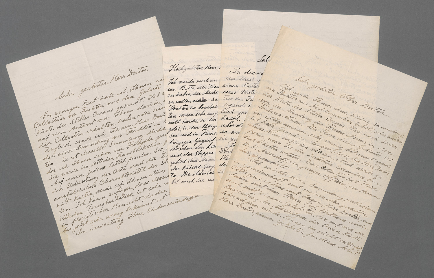 Wissenschaftliche Korrespondenz über Flechtensammlungen aus Nordrussland, der Küste des Stillen Ozeans, der nördlichen Mongolei und Transbaikalien. Palibin übersendet mehrfach Sammlungen ("eine kleine Sammlung von Flechten aus nordrussischem Gebiet, etwas nach Süden von der Mündung des Flusses Amur") und bittet um deren Bearbeitung, Bestimmung und gemeinsame Publikation in deutscher Sprache. Er behandelt sowohl "Phanerogamen" als auch "Cryptogamen" und erwähnt den russischen Reisenden, Offizier W. K. Arsenjew, dessen Material er gemeinsam mit dem finnischen Botaniker Viktor F. Brotherus (1849-1929) und dem Adressaten auswerten un publizieren möchte. Außerdem weist er auf einen weiteren Gelehrten hin, der die Bearbeitung der Meeresalgen der Ozeanküste übernehmen müsste, und fragt: "Kennen Sie nicht vielleicht, Herr Doctor, einen Gelehrten für diese Arbeit?" Die Publikation schlägt er in den "Annalen" des Adressaten oder in einer Ausgabe der "Kaiserl. Akad. der Wissenschaften zu St. Petersburg" vor. In weiteren Schreiben erkundigt er sich nach dem Erhalt der Sendungen, berichtet von neuen Sammlungen aus dem östlichen Transbaikalien, beschreibt Standorte und klimatische Bedingungen ("die Gegend ist sehr interessant in floristischer Hinsicht, da sie noch bis jetzt sehr wenig bekannt ist") und schildert ein Missverständnis im Botanischen Museum, bei dem ein Kasten seiner Flechten versehentlich fehlgeleitet wurde.