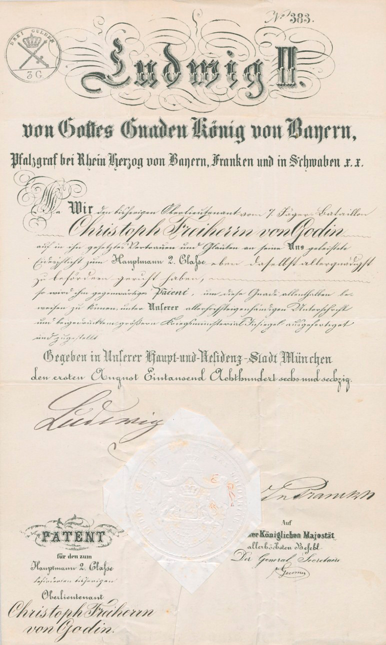 Beförderung des Oberleutnants Christoph Freiherrn von Godin zum "Hauptmann 2. Classe". - Gut erhalten.