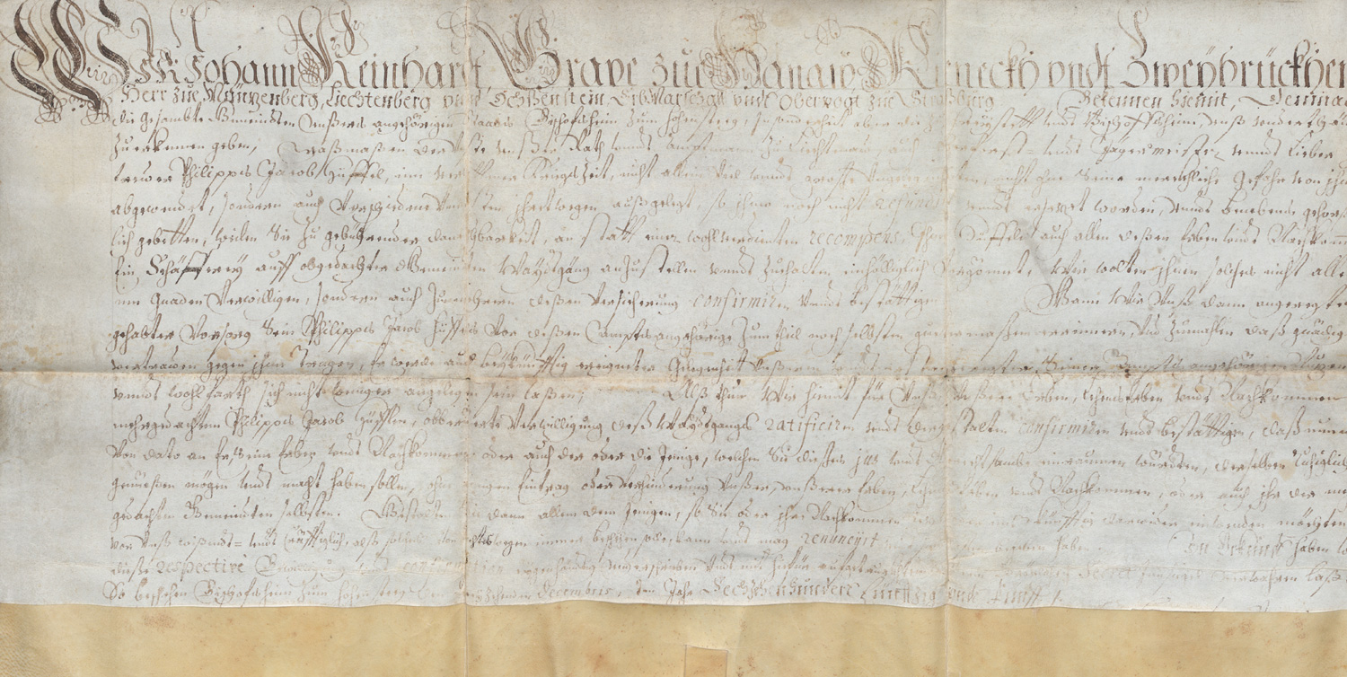 Vorhanden sind: Hagenau im Elsass. Urkunde eines Heinrich von Reveningen. Deutsche Handschrift auf Pergament. Kanzleibastarda in Sepia. Hagenau 1324. - Eis Hs. 184. - Wilhelm Bischof von Straßburg. Lehensbrief. Deutsche Handschrift auf Pergament. Urkunde in brauner Kanzlei-Bastarda mit Plica und gebrochenen Lacksiegelresten. Lehensbestätigung für die Herren Egenolff und Jorge von Waldstein. Straßburg 1425. Eis Hs. 186. - Matzenheim im Elsass. Erbschaftsurkunde eines Hans von Matzenheim Deutsche Handschrift auf Pergament in Kurrentschrift mit Sepiatinte und großer kalligraphischer Initiale "J". Matzenheim 1518. - Eis Hs. 189. - Hanau, Zweibrücken. Ratifizierungsurkund des Grafen Johann Reinhardt zu Hanau, Kieneck und Zweibrücken. Deutsche Handschrift auf Pergament. Mit Kalligraphie und Siegelresten an der Plica. Wohl Hanau 1655. Eis Hs. 180. – Mit üblichen Gebrauchsspuren, meist wohlerhalten, interessantes Forschungsmaterial aus der Sammlung des Heidelberger Germanisten und Mediaevisten Gerhard Eis (1908-1982) mit dessen eigenhändig beschrifteten Umschlägen.