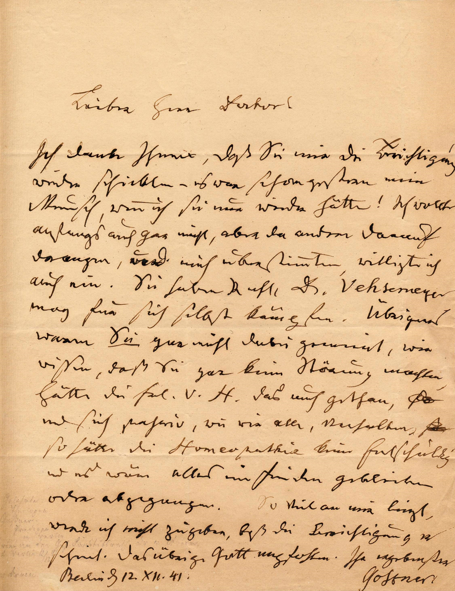 An den Arzt Dr. von Arnim in Berlin, Schützenstraße 66, der ihm den umstrittenen Text einer "Berichtigung" in einem Streit über Homöopathie zurückgeschickt hatte."... Ich danke Ihnen, daß Sie mir die Berichtigung wieder schickten - es war schon gestern mein Wunsch, wenn ich sie nur wieder hätte! Ich wollte anfangs auch gar nicht, aber da andere darauf drangen, und mich überstimmten, willigte ich auch ein. Sie haben Recht, Dr. Vehsemeyer mag für sich selbst kämpfen. Übrigens waren Sie gar nicht dabei gemeint, wir wissen, dass Sie gar keine Störung machten. Hätte die Frl. v. H. das auch gethan, und sich passiv, wie wir alle, verhalten, so hätte die Homöopathie keine Entschuldigung und es wäre alles im Frieden geblieben oder abgegangen ...". - Gleichmäßig gebräunt.