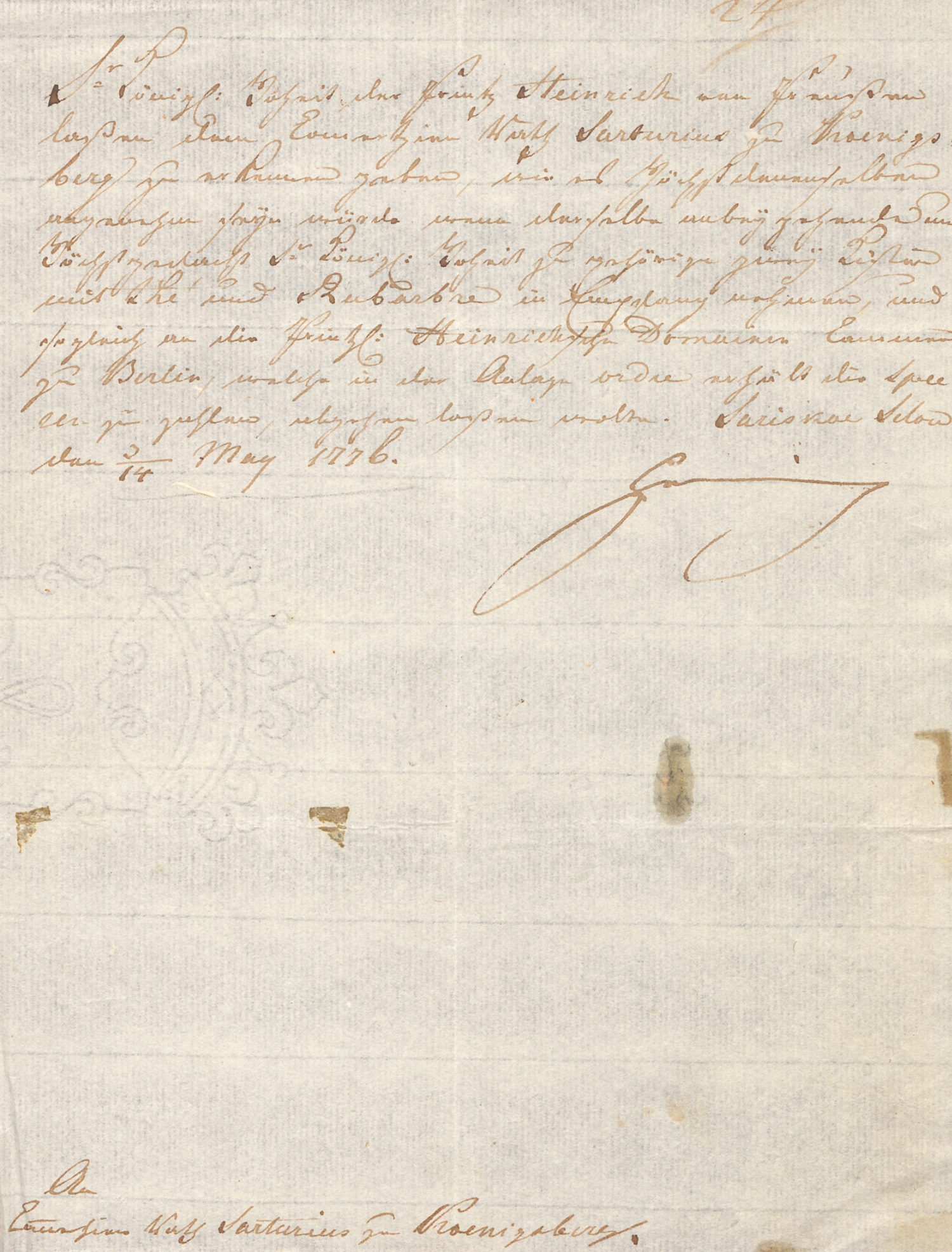 In der dritten Person an den Kommerzienrat Sartorius in Königsberg, dem er mitteilen läßt, "wie es Höchstdenenselben angenehm seyn würde wenn derselbe anbey gehende und Höchstgedacht Sr. König: Hoheit zu gehörige zwei Kisten mit Thé und Rabarbre in Empfang nehmen und sogleich an die Printz. Heinrichsche Domainen Cammer zu Berlin, welche in der Anlage ordre erhält, die Speesen zu zahlen, abgehen laßen wolte ...". - Geschrieben bei Prinz Heinrichs zweitem Besuch bei der Zarin Katharina (der Großen). - In der unteren Hälfte leicht fleckig.