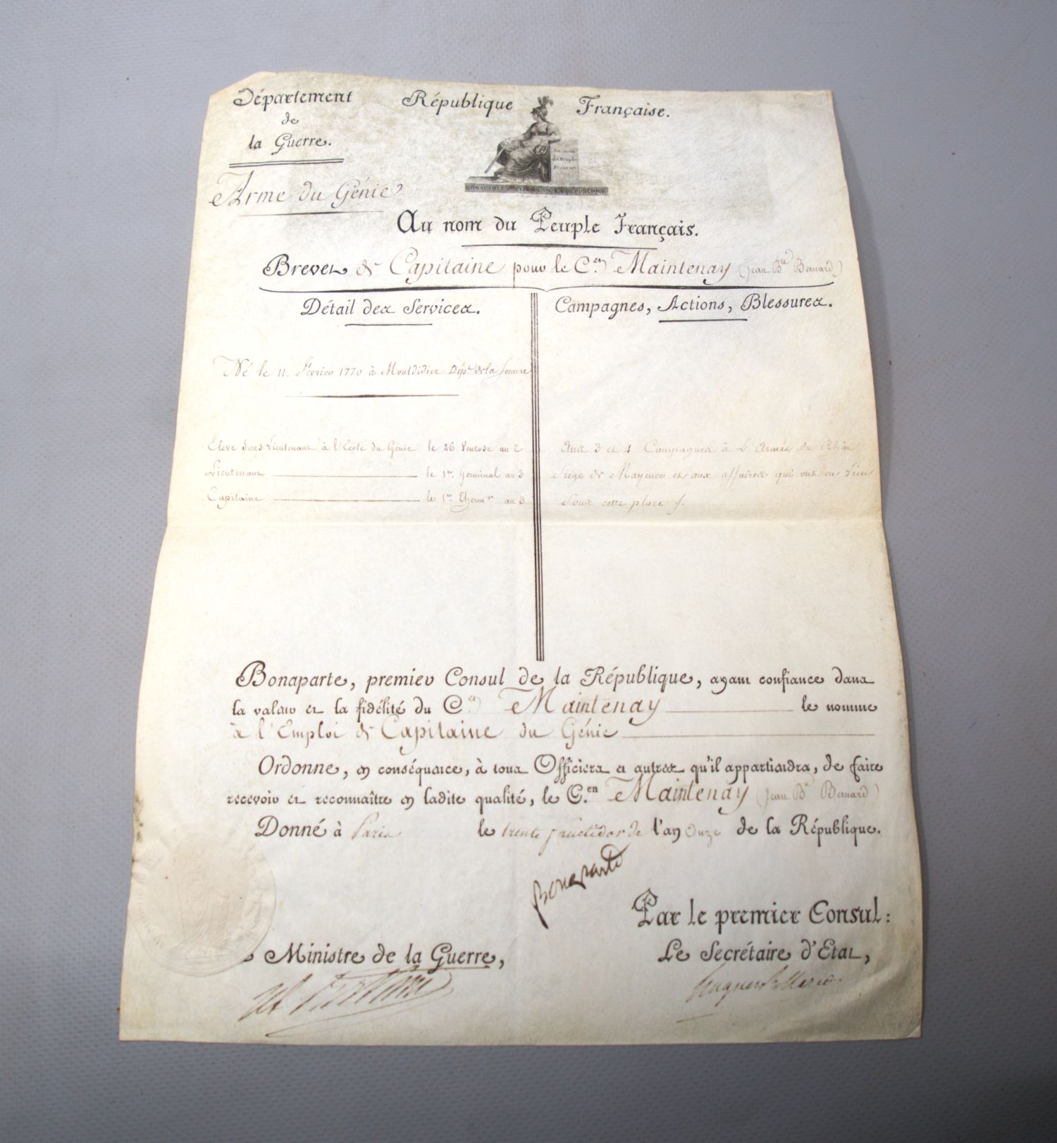 Napoleon als Erster Konsul der Republik unterzeichnet die Beförderung des Jean Baptiste Bernard Maintenay zum "Capitaine du Génie". Mit tabellarischer Angabe seiner Laufbahn und seiner Teilnahme an der Eroberung von Mainz. - Mitunterzeichnet vom Kriegsminister Alexandre Berthier, Prince de Neuchâtel, Fürst von Wagram (1753-1815). - Gut erhaltene Pergament-Urkunde aus der ersten Phase der Regierung Napoleons. - Der Namenszug "Bonaparte" wird von den meisten Forschern der Hand seines Sekretärs Hugues Bernard Maret (des späteren Herzogs von Bassano) zugeschrieben.