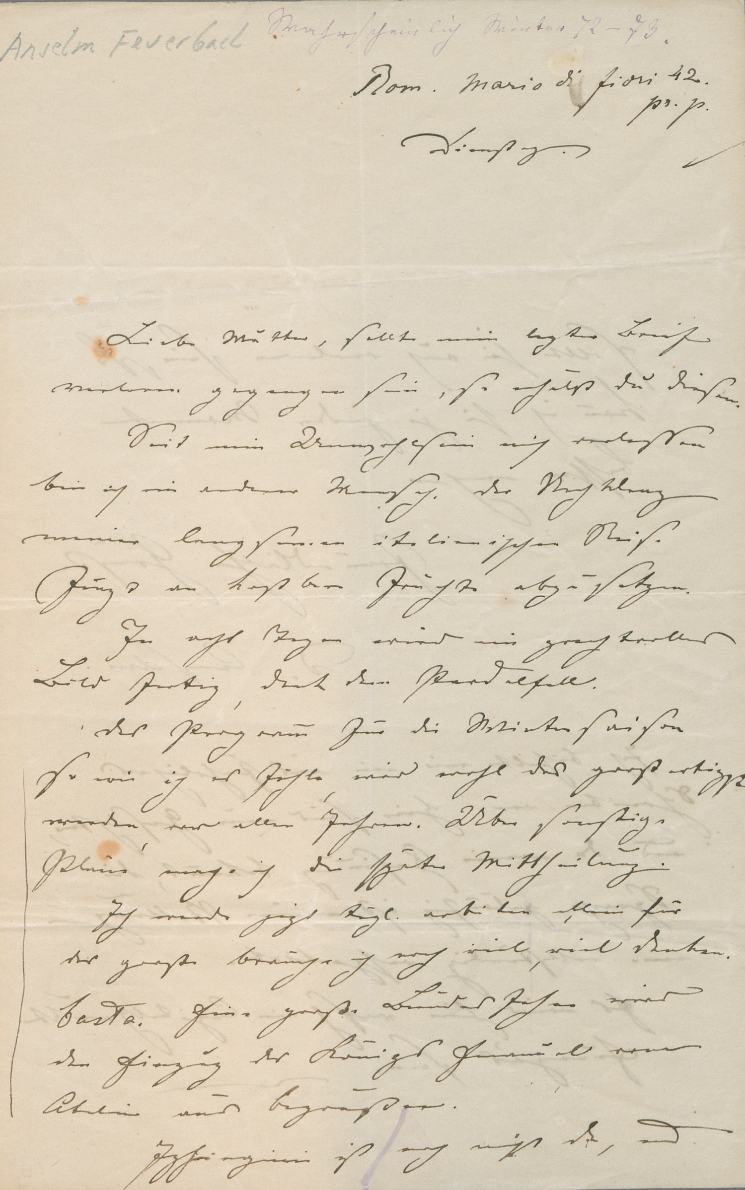 Feuerbach, Anselm, Maler (1829-1880). Eigh. Brief m. U. "Anselm". 2 S. Doppelbl. Gr. 8vo. Rom, "Dienstag" (um 1870).