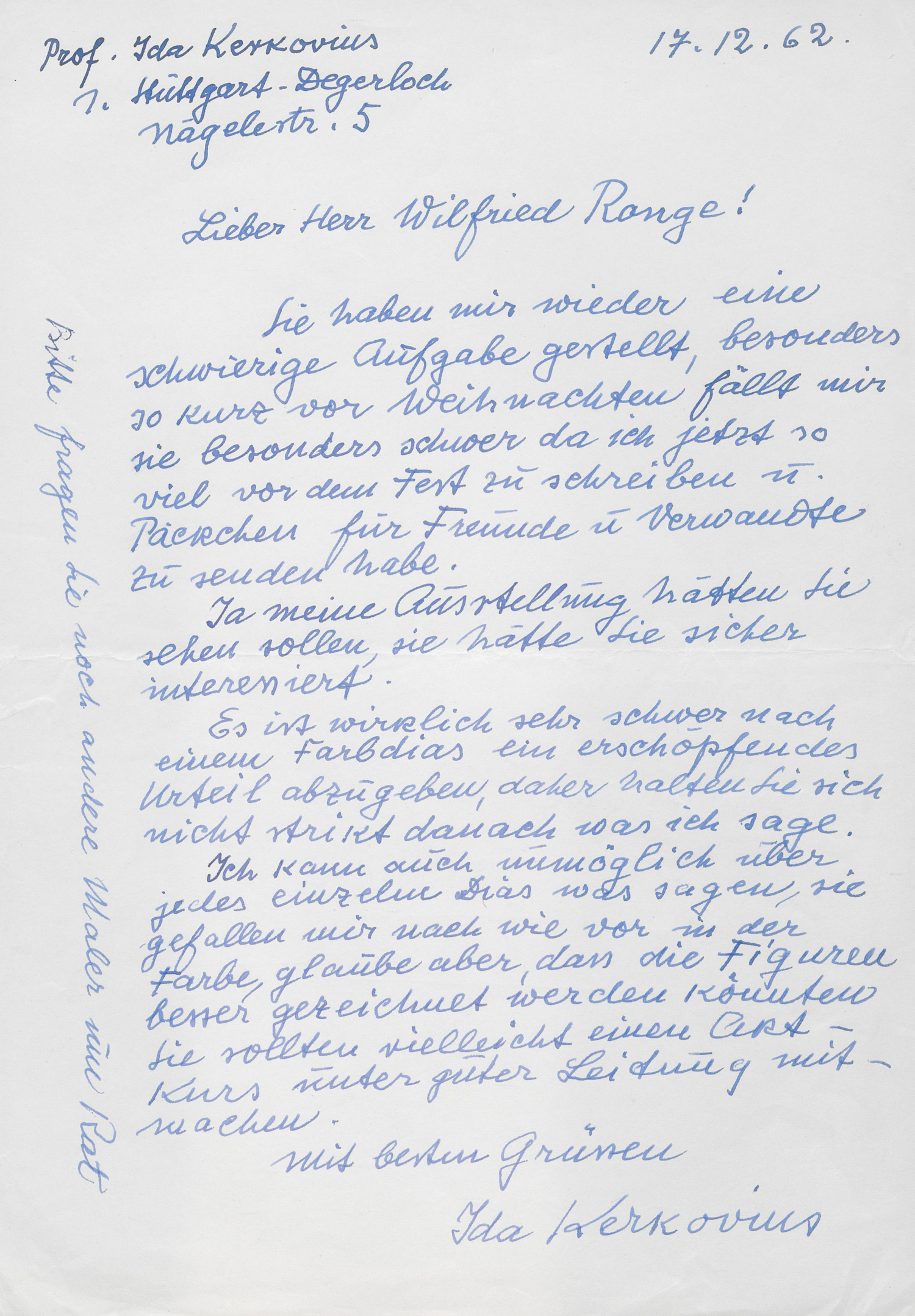 An den Maler Wilfried Range, der ihr Dias von eigenen Werken zur Beurteilung schickte. "... ich habe sehr wenig Zeit. Trotzdem habe ich Ihre Dias alle angeschaut. Ich stelle fest, dass Sie einen ausgesprochenen Sinn u. Begabung für die Farbe haben u. rate Ihnen in dem Sinne weiter zu malen. Die Bilder mit Figuren gefallen mir weniger. No 12 u. 14 sind besser, so sollten Sie weiter arbeiten. Aber das Bild Petruschka u. die Sünderin, ein figürliches Bild, hat natürlich auch seine Berechtigung [1.XI.1962] ... Ja meine Ausstellung hätten Sie sehen sollen, sie hätte Sie sicher interessiert. Es ist wirklich sehr schwer nach einem Farbdias [sic] ein erschöpfendes Urteil abzugeben, daher halten Sie sich nicht strikt danach, was ich sage. Ich kann auch unmöglich über jedes einzelne Dias was sagen, sie gefallen mir nach wie vor in der Farbe, glaube aber, dass die Figuren besser gezeichnet werden könnten. Sie sollten vielleicht einen Akt-Kurs unter guter Leitung mitmachen [17.XII.1962] ... Wollen Sie sich nicht inzwischen meine Ausstellung in Göppingen ansehen im Stadthaus ..." [5.X.1963].