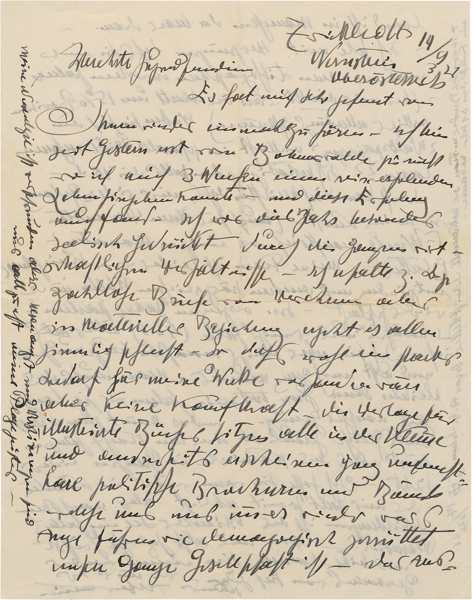 An seine "Jugendfreundin" Mizi Klein-Gierth. Umfang- und inhaltsreiche Briefe mit vielerlei Mitteilungen sowie Kritik an der politischen Entwicklung und den wirtschaftlichen Folgen von Hitlers "Machtergreifung" in Deutschland. Auch über seine Nieren-Erkrankung und andere Leiden bei ihm und seiner Frau gehören zu den Themen. "... Jedenfalls war mir deshalb, in der Einsamkeit des Krankenbettes, alles gleichgültig was 'draussen' in der Welt geschah, so auch die 'Volks-Erhebung' in Deutschland - hintnach sah ich allerdings daß zunächst aus dieser Umgestaltung nur Schaden für meine Person und einen großen Theil meiner Freunde kam. Alle Aufträge die ich noch hatte, wurden abgesagt, ebenso einige Ausstellungen, weil die betreffenden Herren ihre Stellungen verlassen. Später kommt vielleicht eine bessere Zeit für die Kunst, die ... außerhalb der Interessen scheint ... es ging die letzten beiden Jahre schon sehr knapp mit den Einnahmen trotz daß mein Ruf über die Erde ging und ich da alles erreicht was ich erwarten konnte ... Man fasst dies alles als völlig unpolitischer Künstler gar nicht, seit 1914 haben wir eigentlich keine Ruhe mehr ... es ist im Grunde miserabel alles, dennoch hoffe ich wie ein Kork bis zum letzten Atemzug auf dem Meere des Lebens zu schwimmen ohne unterzugehen, denn in all dem Graus wirkt mir die Kunst als Ventil - da mag es noch so barbarisch zugehen, dieser innere Funken bleibt, und siegt schließlich [1.VII.1933] ... Ich war dies Jahr besonders seelisch gedrückt durch die ganzen wirtschaftlichen Verhältnisse - Ich erhalte z. B. zahllose Briefe von Verehrern, aber in materieller Beziehung ergeht es allen ziemlich schlecht - so daß wohl ein starker Bedarf für meine Werke erstanden wäre, aber keine Kaufkraft - Die Verlage für illustrierte Bücher sitzen alle in der Klemme und andrerseits erscheinen ganz unfruchtbare politische Brochuren und Bände, welche uns nur immer wieder vor's Auge führen wie demagogisch zerrüttet unsere ganze Gesellschaft ist ...". Kommt dann auf eine seiner "neuen Lithographien" zu sprechen und resümiert: "... Sonst kann ich berichten, daß mir vieles gelang in meiner Kunst ..." [19.IX.1934]. - Auf der Postkarte, die mit einer gedruckten Zeichnung der Zwickledter Kirche illustriert ist, berichtet Kubin: "... Ich konnte wieder Einiges schaffen, ein Zyklus 'Die Planeten' mit 9 Blatt entstand ..." [22.VII.1935]. - Beiliegend das graphische Dankesblatt für die Glückwünsche zu Kubins 75. Geburtstag, 2 hs. Briefumschläge und 1 Orig.-Photographie (11 x 8,8 cm), die den Künstler mit dem deutsch-böhmischen Schriftsteller Hans Watzlik (1879-1948) an einem Geländer vor Waldhintergrund zeigt, rückseitig von Kubin beschriftet: "Der böhmische Dichter Hans Watzlik. Vorletzte Aufnahme Herbst 30 in Eisenstein; Böhmerwald". - Wertvolle Bekenntnisse des Künstlers vor dem politischen Hintergrund.