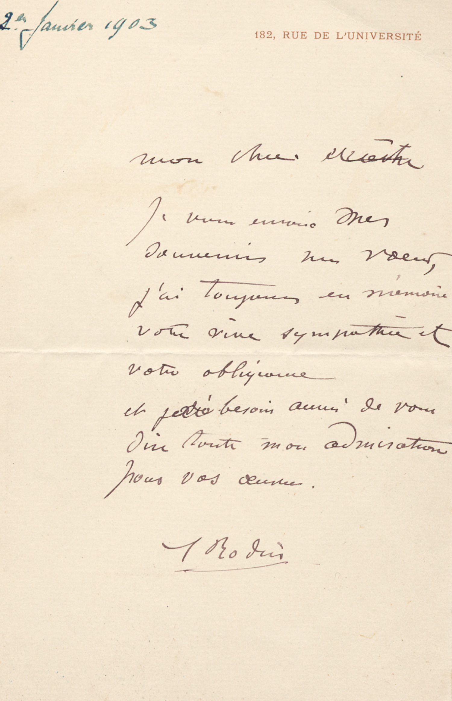 Rodin, Auguste, franz. Bildhauer und Graphiker (1840-1917). Eigh. Brief (Billet) m. U. "A Rodin". 1 S. Doppelblatt. 8vo. O. O., Rue de l'Université, (2.I.1903).