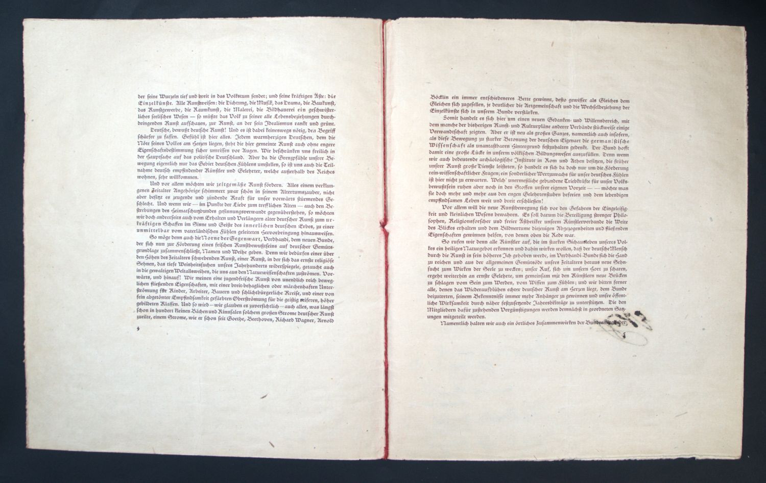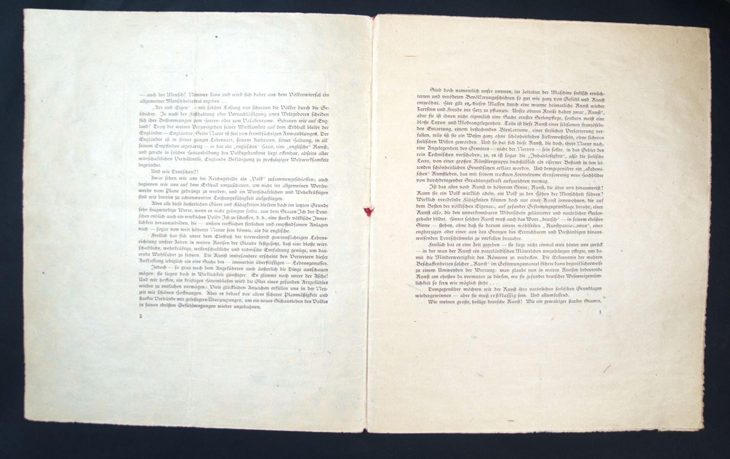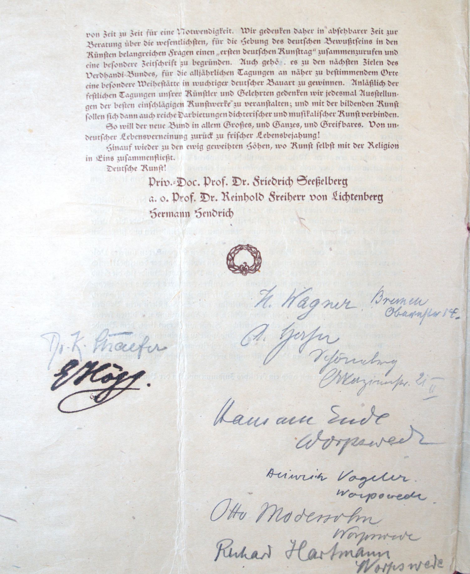 Geänderte Version des Programm- und Propaganda-Heftes der extrem deutschnationalen und völkischen Bewegung. Es fehlt der große, düstere und wenig anziehende Textholzschnitt von Friedrich Seesselberg, und der Text ist stellenweise umformuliert. Statt "Von undeutscher Lebensverneinung zurück zu fröhlicher Lebensbejahung" heißt es hier: "zu frischer Lebensbejahung". Und der Titel ist handschriftlich (wahrscheinlich von Heinrich Vogeler) verändert: die Formulierung "zur Förderung jungdeutscher Kunst" ist mit Tinte gestrichen und ersetzt durch "bodenständiger Kunst und Kultur". Am Schluss haben (meist mit Bleistift) signiert: H. Wagner (Bremen), A. Hahn (Schöneberg bei Berlin), der Maler Hans am Ende (Worpswede), der Maler, Graphiker und Illustrator Heinrich Vogeler (Worpswede), der Maler Otto Modersohn (Worpswede), der Maler Richard Hartmann (Worpswede), der Kunsthistoriker und Museumsdirektor Dr. Karl Schaefer und der Architekt Emil Högg. - Bemerkenswert ist, dass diese Gruppe von Künstlern und Kunsthistorikern bei der Gestaltung des Heftes offensichtlich für Mäßigung in Titel und Formulierungen eintrat. - Leichte Gebrauchsspuren.