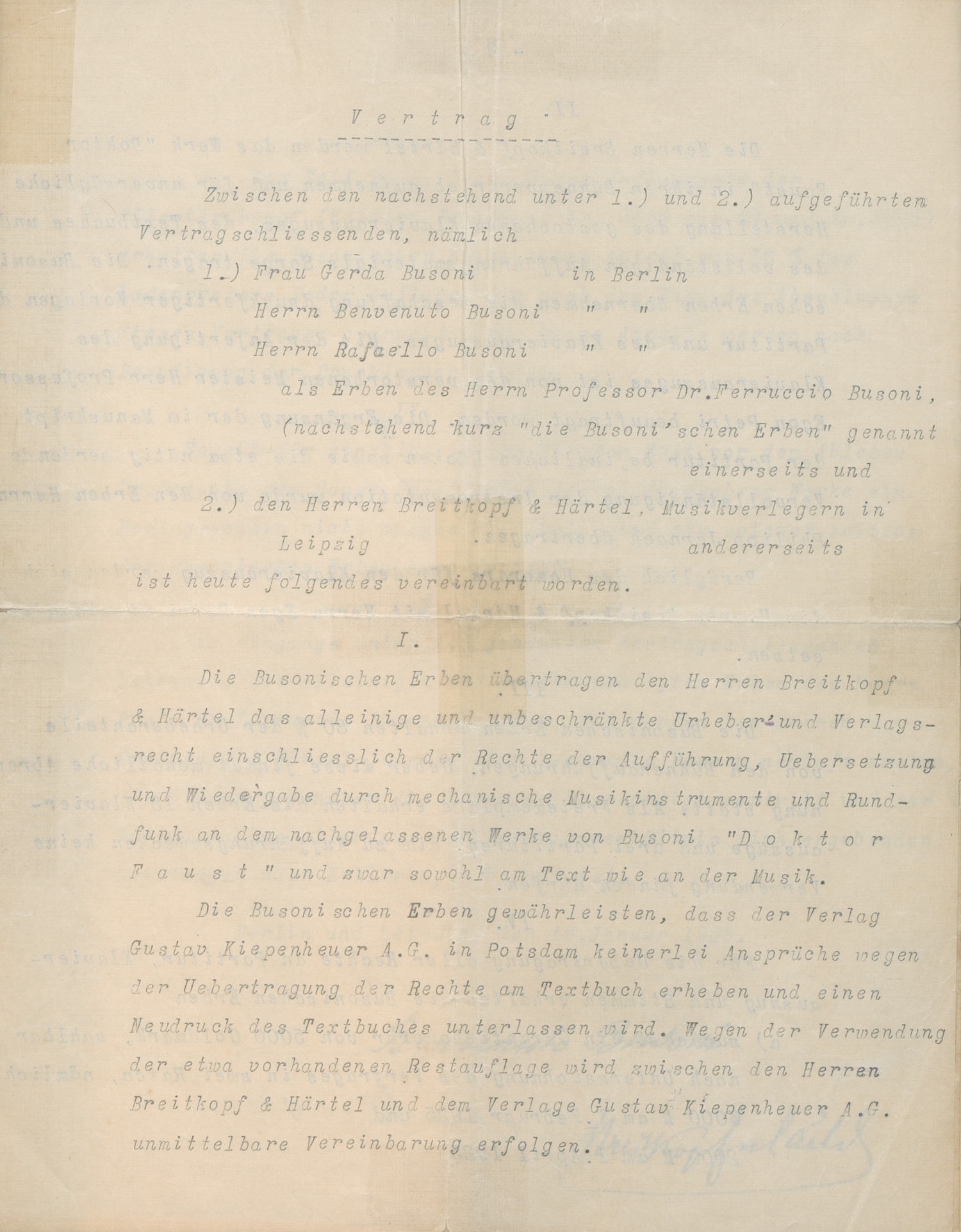 Verträge, betreffend zunächst die Übertragung sämtlicher Rechte an Busonis nachgelassener Oper "Doktor Faust" an den Musikverlag Breitkopf & Härtel, einschließlich des Textes (der bisher von Kiepenheuer verlegt wurde), des Klavierauszugs und aller Bearbeitungen und Veröffentlichungen, zu denen sich der Verlag verpflichtet. "... Die Busonischen Erben erhalten 80 % der Urheberanteile von den Bühnenaufführungen. Ueber diese findet monatliche Abrechnung statt. Als Freiexemplare erhalten die Erben 15 Klavierauszüge und drei Partituren, die zu Aufführungszwecken keine Verwendung finden dürfen. - Für die Uebertragung aller Rechte an Partitur, Klavierauszug und Stimmen erhalten die Busonischen Erben zunächst ein Garantiehonorar von 5000 Goldmark ...". Ferner "ein auf den Erfolg des Werkes abgestelltes Nachhonorar von neunmal je 5000 Goldmark, zahlbar nach erfolgter Aufführung des Werkes ... innerhalb der 30jährigen Schutzfrist ...". - Ein zweiter Vertrag legt fest, dass der Verlag für die Honoraransprüche des Verstorbenen an die Erben 20.000 Goldmark zahlt, unabhängig von den Urheber-Anteilen. Alle Zahlungen erfolgen in Raten. - Interessante Informationen über den "Marktwert" der Kompositionen Busonis nach Ende der Inflation. - Knickfalten; kleine Läsuren mit Transparentpapier repariert.