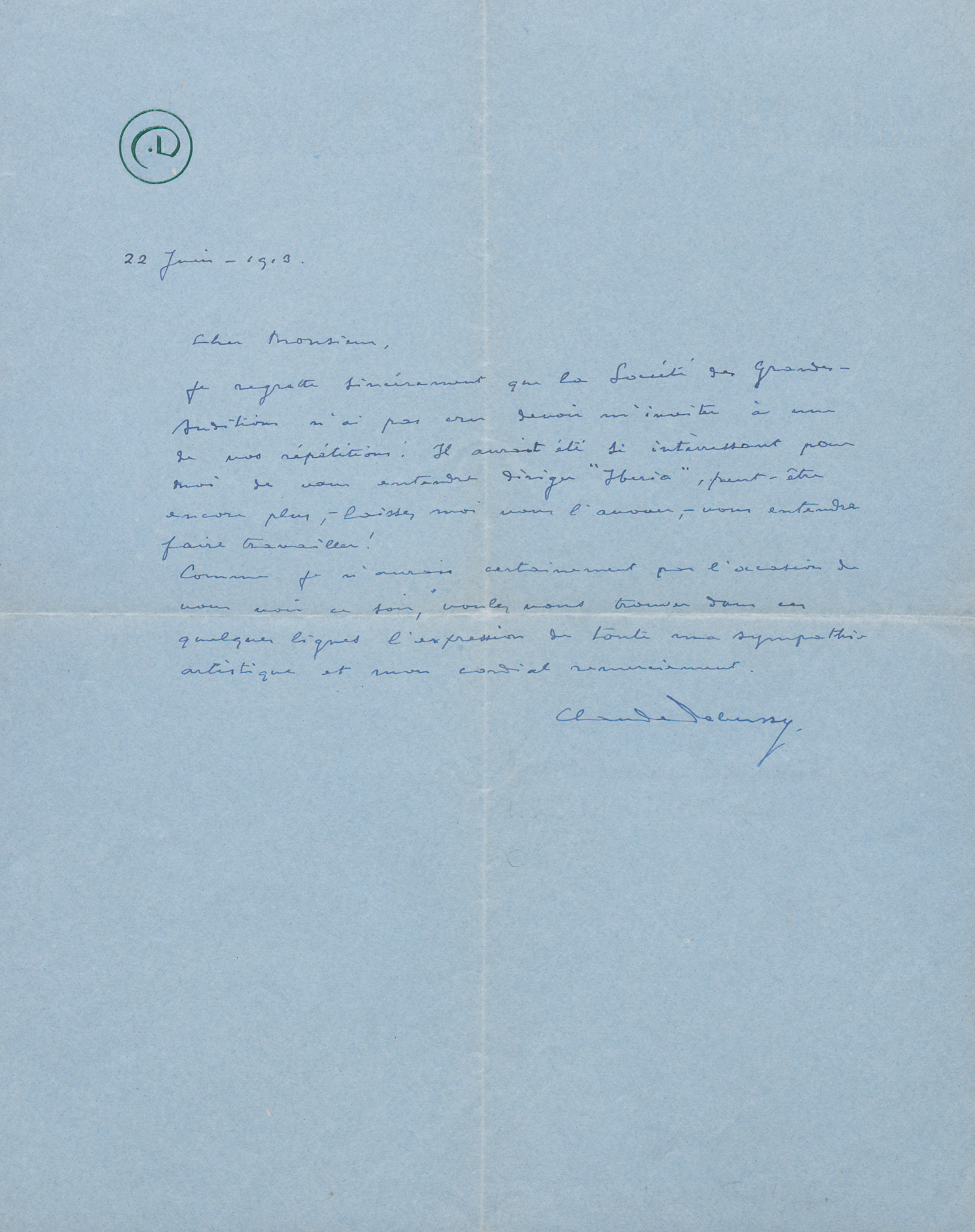 Debussy, Claude, franz. Komponist (1862-1918). Eigh. Brief m. U. "Claude Debussy". 1/2 S. Auf blauem Papier mit Monogramm "CD". Gr. 4to. O. O. 22.VI.1913.