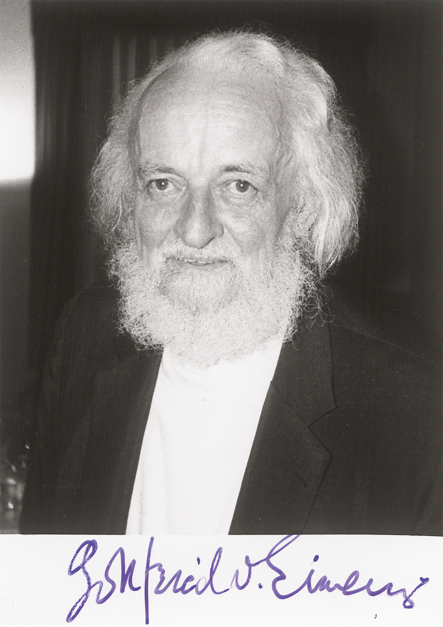 Vorhanden: Musikal. Albumblatt m. U., aus "Prinzessin Turandot". Zürich 1.IV.1959. - 2 musikal. Albumblätter m. U., das eine auch mit Widmung, aus "Der Zerrissene". Wien 8.V.1968 und 5.IV.1991. - Musikal. Albumblatt m. U. und Widmung, aus "Dantons Tod". Wien 11.XI.1974. - Musikal. Albumblatt m. U. und Widmung, aus "Der Besuch der alten Dame". O. O. 24.II.1975. - Porträtfoto-Postkarte mit eigh. Signatur auf der Bildseite. Wien 14.II.1959. - Porträtfoto mit eigh. Signatur auf der Bildseite. 17,8 x 12,6 cm. O. O. (wohl um 1990). - Eigh. Dankesbrief m. U. an einen Verehrer, der ihm eine Cassette mit der Aufnahme eines Jubiläumsgottesdienstes in einer Stiftskirche (wohl mit Einems Musik) übersandt hatte. Rindlberg 1.II.1990. - Eigenhändig beschriftete Dankeskarte für Glückwünsche zum Geburtstag, gerichtet an mehrere Personen, aus einer Klinik in Bern geschrieben und unterzeichnet: "der kanarigelbe allmählich aber rosig erblühende Gottfried Einem". - Schöne Sammlung zur Musik und Person des Künstlers. - Das Albumblatt von 1959 gebräunt.