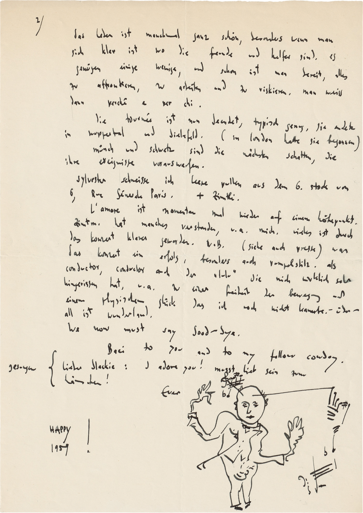 Viele Werke kommen zur Sprache, darunter das "Undine"-Ballett, "König Hirsch", "Die Bassariden" und natürlich "Der junge Lord". Henzes berufliche Beziehungen zu einem großen Teil der Prominenz des europäischen Musiktheaters auf seinen Reisen werden behandelt, darunter die Dirigenten Karajan, Dóhnanyi und Sawallisch. Henze, der ja immer qualitätvolle, bereits berühmte Textvorlagen für seine Kompositionen wählte, erörtert auch mancherlei unausgeführte Projekte. Und immer wieder lange Abhandlungen über Musiktheater im allgemeinen und seine Arbeiten im besonderen. - Beiliegend das 4seitige masch. Konzept eines Briefes von Geitel an Henze, 4 handschriftliche Briefe (einer auf der Rückseite eines Henze-Briefes) von dem Schauspieler Folker Bohnet, als dessen "lover" sich Henze bezeichnet, sowie eine handschriftliche Besetzungsliste. - Die große Brieffolge Hans Werner Henzes bildet eine außerordentlich dichte und aussagekräftige Chronik vom Leben und Schaffen des gefeierten Komponisten in der Epoche seiner größten Erfolge.