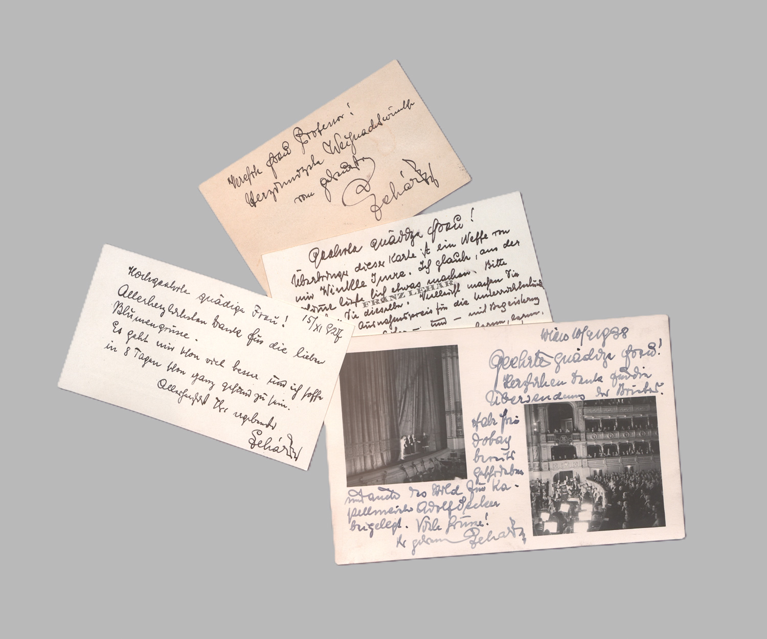 Lehár, Franz, Operettenkomponist (1870-1848). Konvolut von eigh. Mitteilungen an eine Konzertsängerin. Verschied. Orte und Formate. 1925-1940.