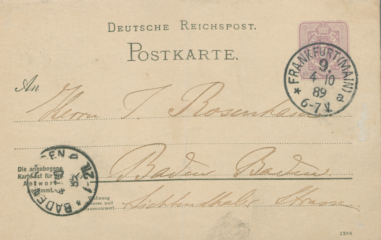 (1819-1896)Postkarte nach Baden-Baden. 1889