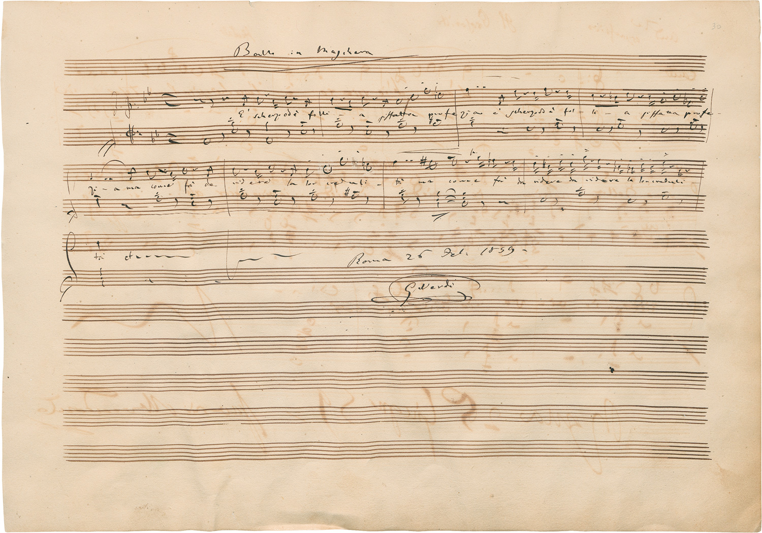 "Ballo in Maschera". 9 Takte auf 5 Systemen, mit Text. Arie des Riccardo aus der 10. Szene des I. Aktes der Oper "Un Ballo in Maschera". Geschrieben 9 Tage nach der am 17. Februar 1859 erfolgten Premiere im römischen Teatro Apollo. Den Part des Riccardo sang Gaetano Fraschini. Titel, Schauplatz und Inhalt hatte Verdi ändern müssen, ehe die Oper in Italien und dann weltweit aufgeführt werden konnte. - Leicht gewellt und mit geringen Tintenspuren von einem anderen Blatt. - Beiliegend eine Porträt-Photographie Verdis (neuerer Abzug; 17,3 x 12,3 cm).