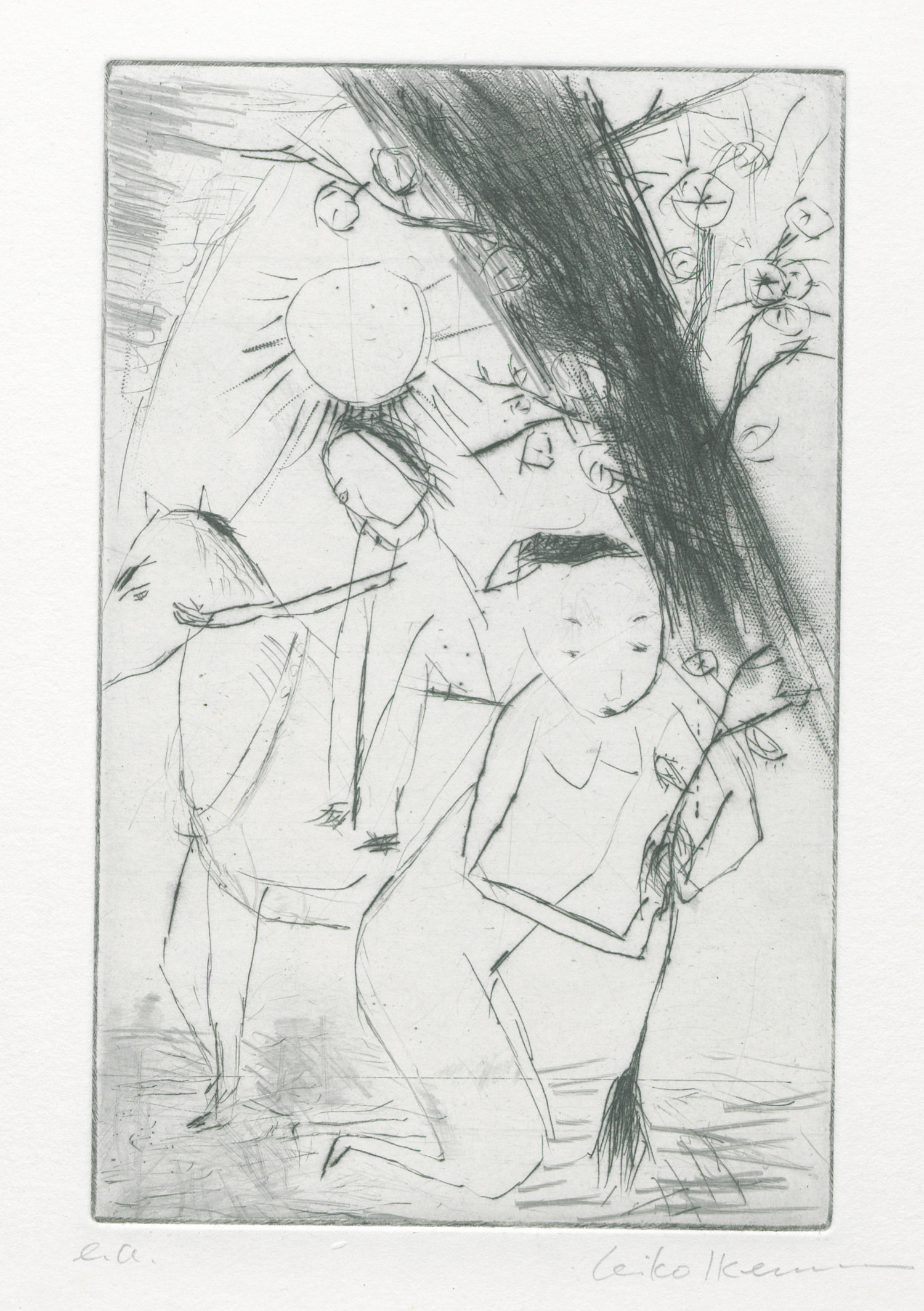 Bashô, Matsuo. Hundertundelf Haiku. Ausgewählt, übersetzt und mit einem Begleitwort versehen von R.-R. Wuthenow. 131 S. Mit zahlr. Zeichnungen und 1 separaten Original-Radierung (Platte: 19 x 12 cm) von Leiko Ikemura. 19 x 11,5 cm. OLeinen, die Graphik unter Passepartout, zusammen in schwarzer Folio-OLeinen-Kassette (etwas angestaubt). Zürich 1987.
