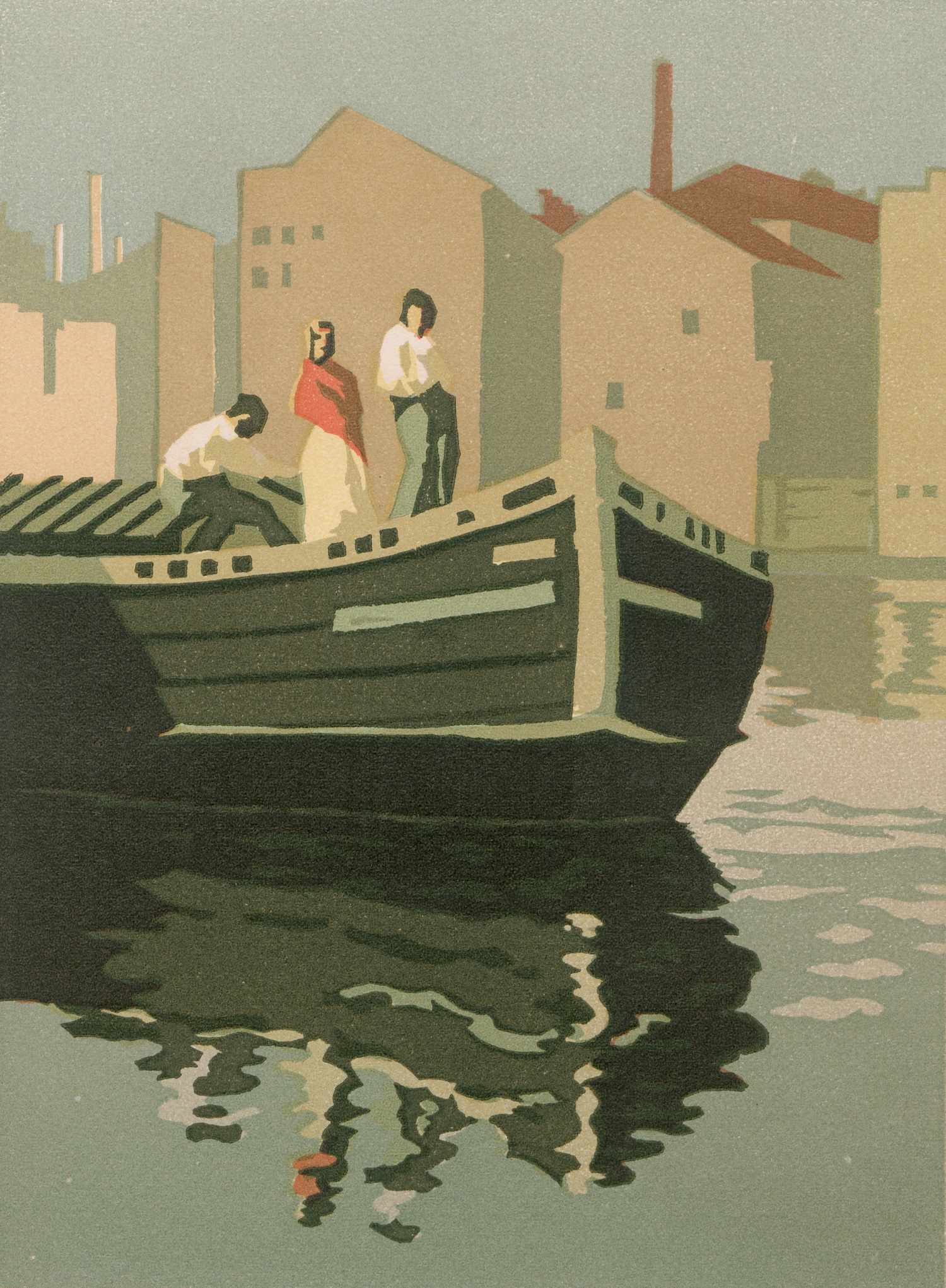 Baudnik, Aemilian. Farbige Erlebnisse. Linoleumschnitte. Mit einem Geleitwort von Friedrich Düsel. 2 Bl. Mit 6 signierten Originallinolschnitten von Ae. Baudnik. 36 x 27,5 cm. Lose Bl. in illustr. OHalbleinen-Flügelmappe. Berlin, Volksverband der Bücherfreunde Wegweiser-Verlag, 1924.