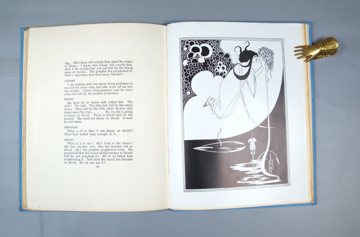 Beardsley, Aubrey. - Wilde, Oscar. Salomé. A tragedy in one act: translated from the French of Oscar Wilde. 75 S. Mit 16 ganzseitigen Illustrationen von Aubrey Beardsley. Hellblauer OLeinenband (etwas berieben) mit goldgeprägtem RTitel. London, Melmoth, 1904.