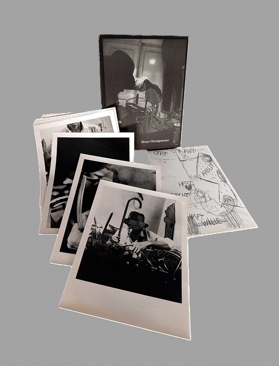 Beuys, Joseph. Honigpumpe. Eine signierte Serigraphie nach einer Zeichnung von Joseph Beuys und 15 losen Fotografien von Jochen Hiltmann, zusammen mit Textheft und Audiokassette in Originalkarton (leicht bestoßen). 30,5 x 24 cm. Hamburg, Spuren - Zeitschrift für Kunst und Gesellschaft, 1985.