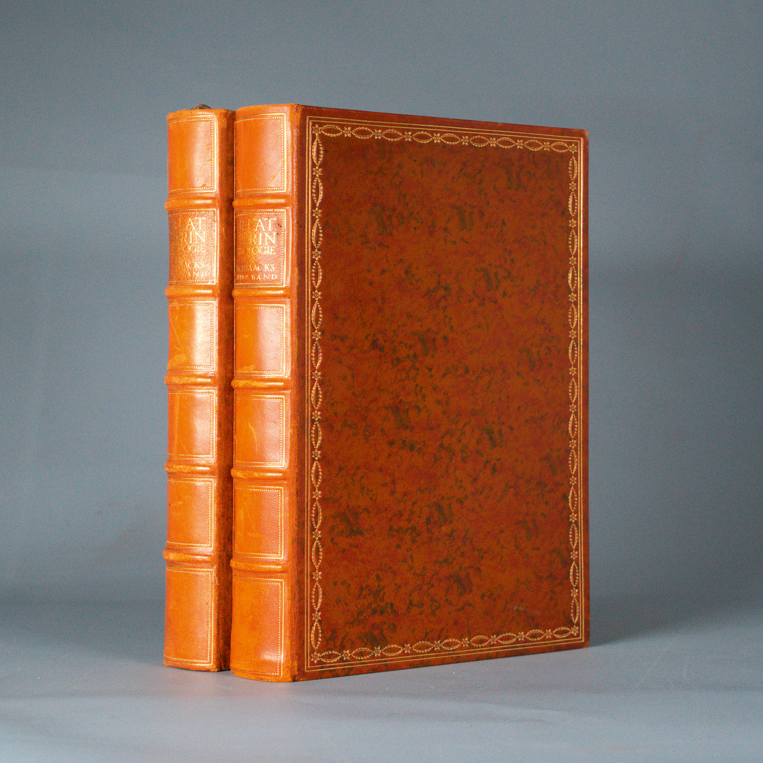 Brillat-Savarin, (Jean Anthelme). Physiologie des Geschmacks oder Betrachtungen über transzendentale Gastronomie. 2 Bände. 1 Bl., XIV S., 1 Bl., 291 S., 1 Bl.; 3 Bl., 323 S., 323 S., 1 Bl. 19 x 13 cm. Marmoriertes OLeder (Deckel mit schwachen Kratzspuren, Rücken schwach ausgeblichen) mit RVergoldung, goldgeprägtem RSchild, Deckelfileten und KGoldschnitt. München, Georg Müller, 1913.
