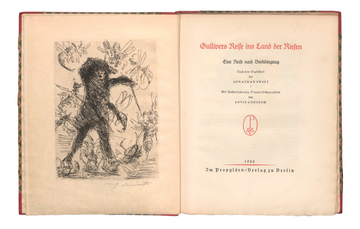 Corinth, Lovis. - Swift, Jonathan. Gullivers Reise ins Land der Riesen. Eine Reise nach Brobdingnag. Nach dem Englischen. 75 S., 1 Bl. Mit 25 (davon 10 ganzseitigen) Original-Lithographien von Lovis Corinth. 33,5 x 26 cm. OHalbmaroquin (Entwurf: H. Steiner-Prag) mit RVergoldung. Berlin, Propyläen, 1922.